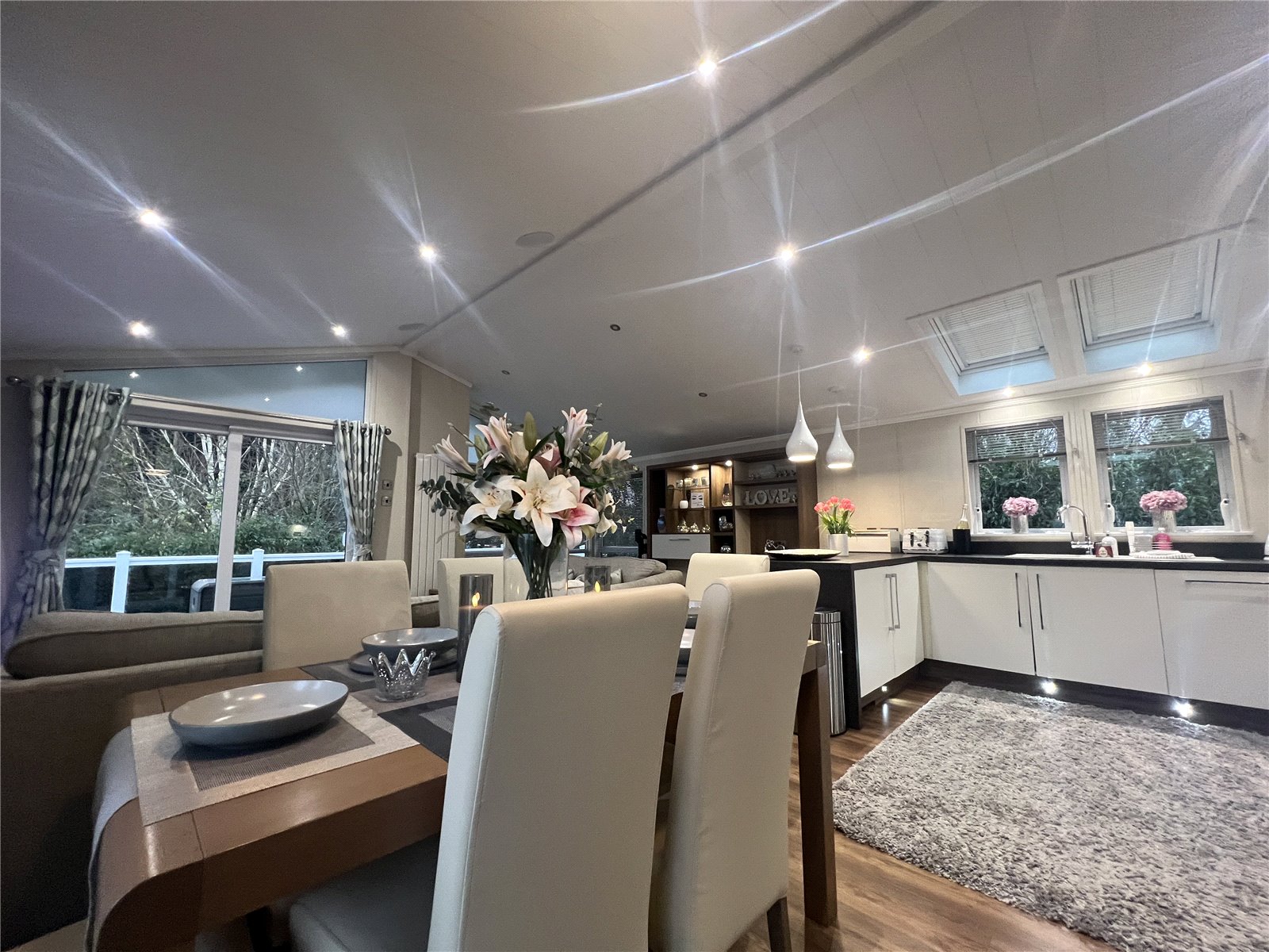 Lovely light and airy open plan area with windows to all sides, double glazed doors in, sliding doors to decked area, velux roof windows.
