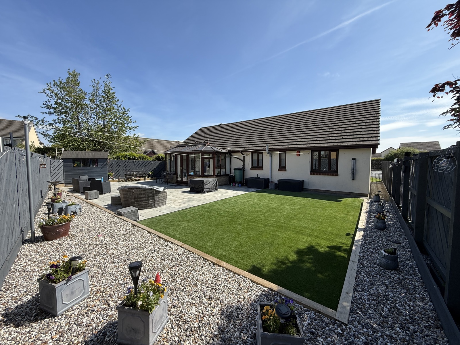 To the rear, a charming conservatory offers a cosy space to enjoy the outdoors in all seasons, leading out onto a gorgeous, low-maintenance garden laid with patio slabs and artificial grass, ideal for those wanting to enjoy their outdoor space without the hassle of heavy upkeep.