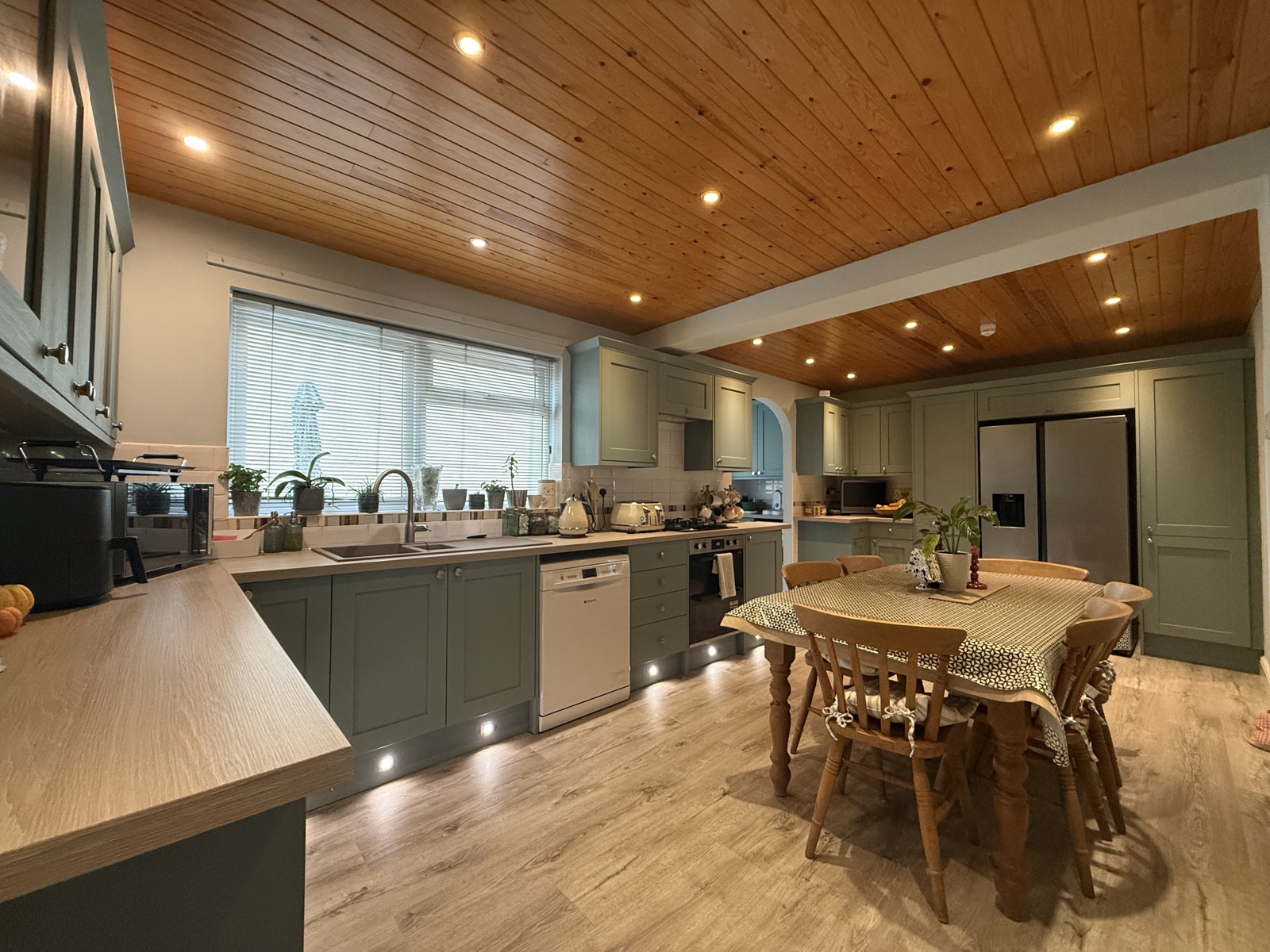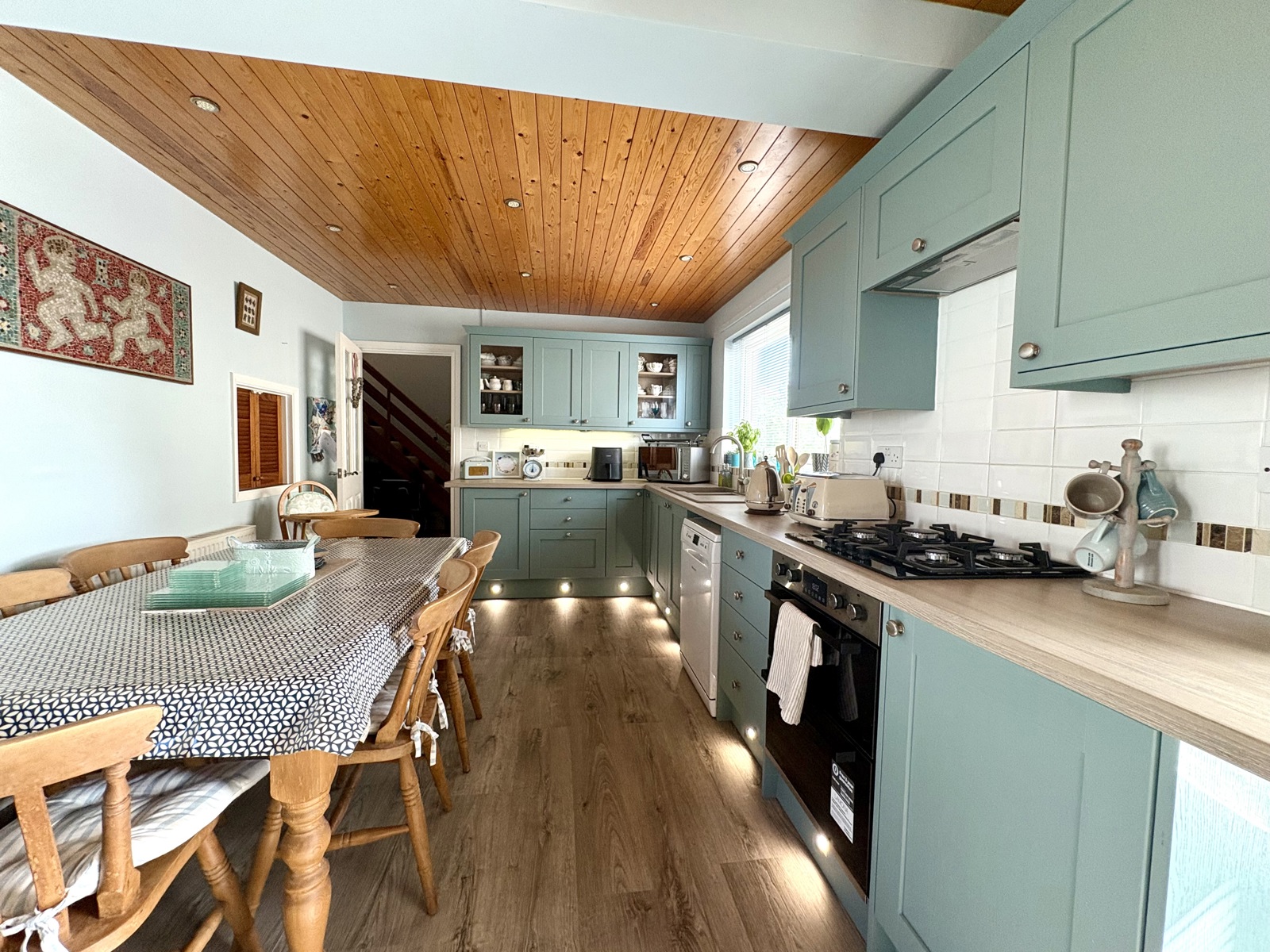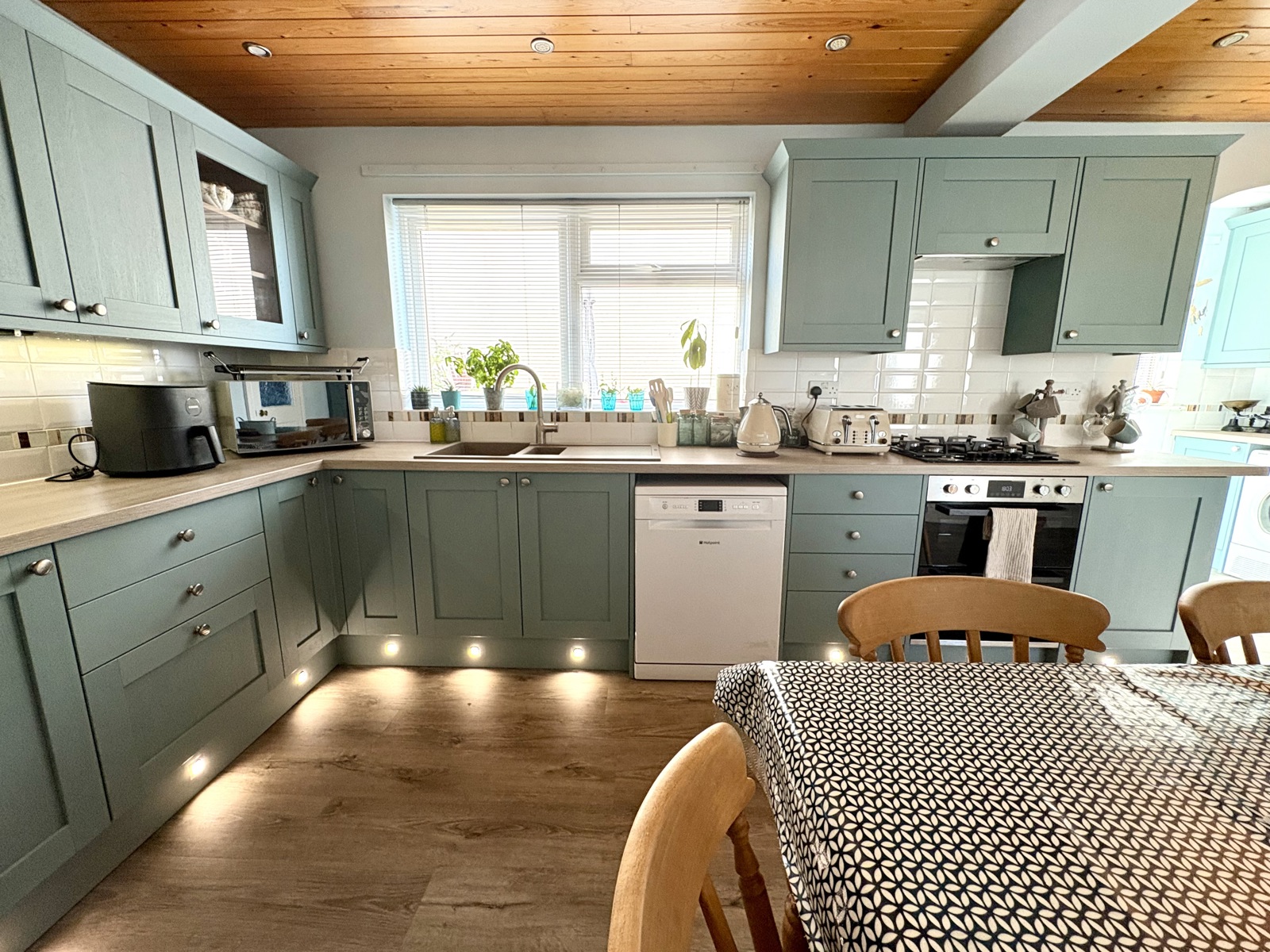 Laminate flooring, base and wall mounted cupboards, tile splashback space for washing machine and tumble dryer, gas boiler, double glazed uPVC window.