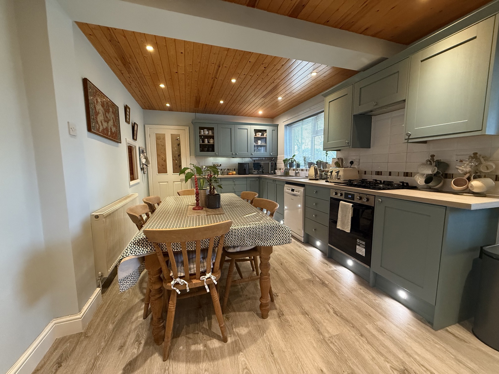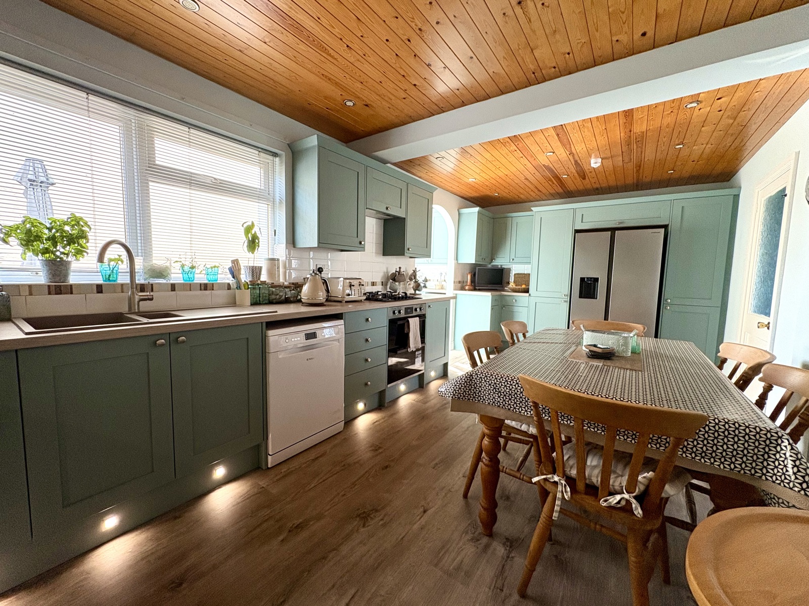 Laminate flooring, range of base and wall mounted units, tile splashback, double oven and hob, space for fridge freezer and dishwasher, radiator, double glazed uPVC window.