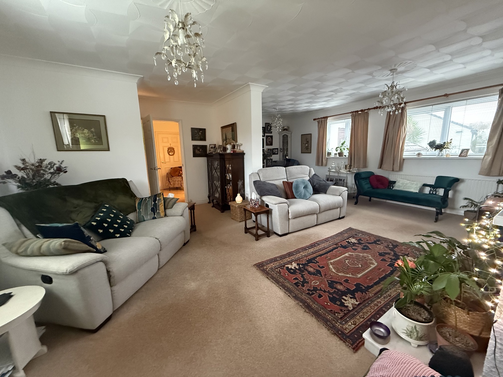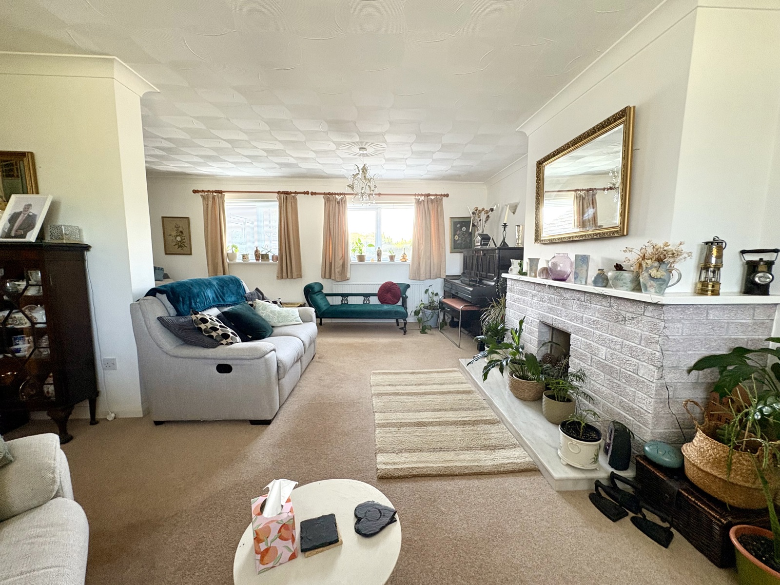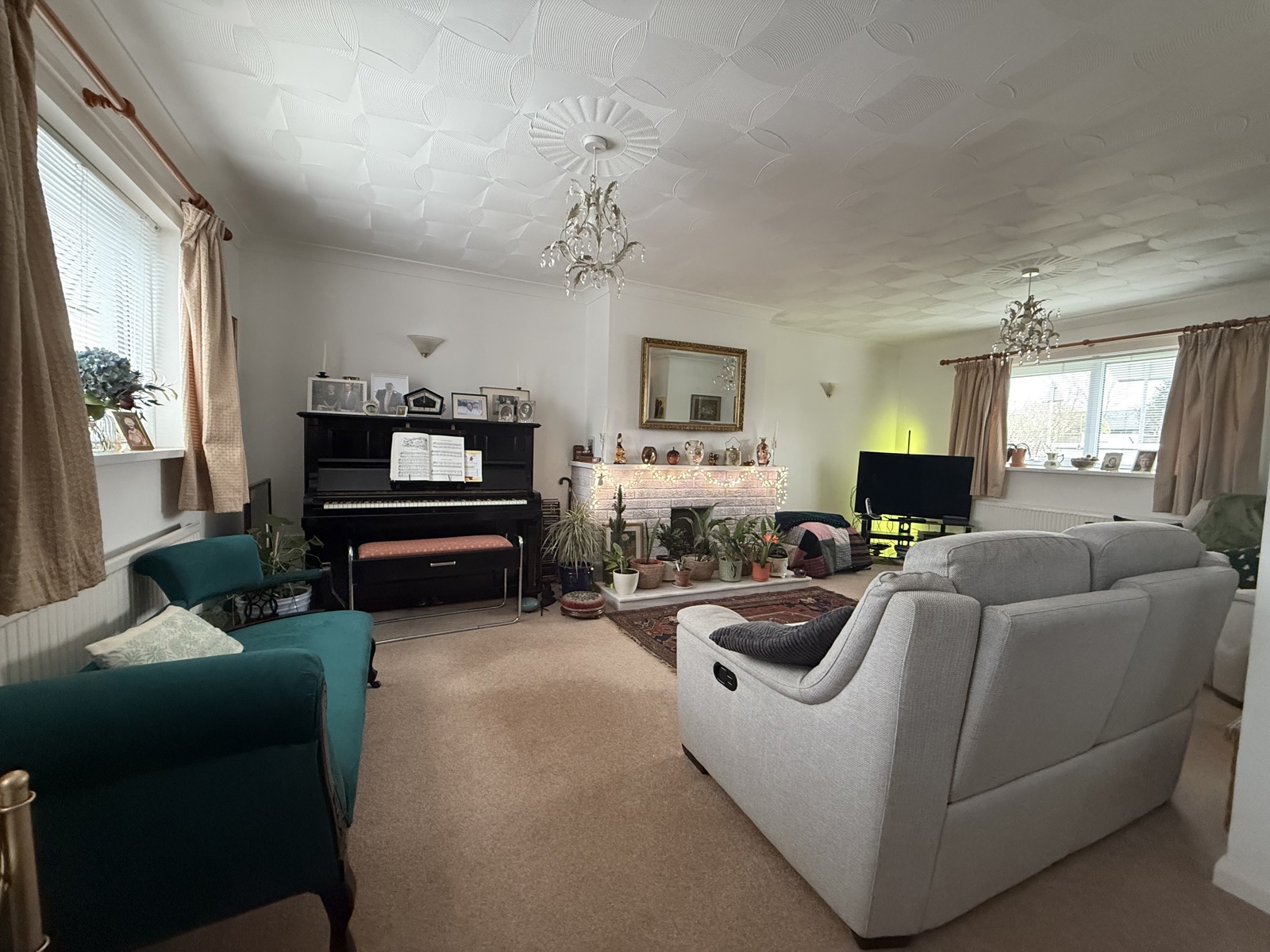 Carpet flooring, fireplace (gas has been capped), 3x radiator, 3x double glazed uPVC windows.