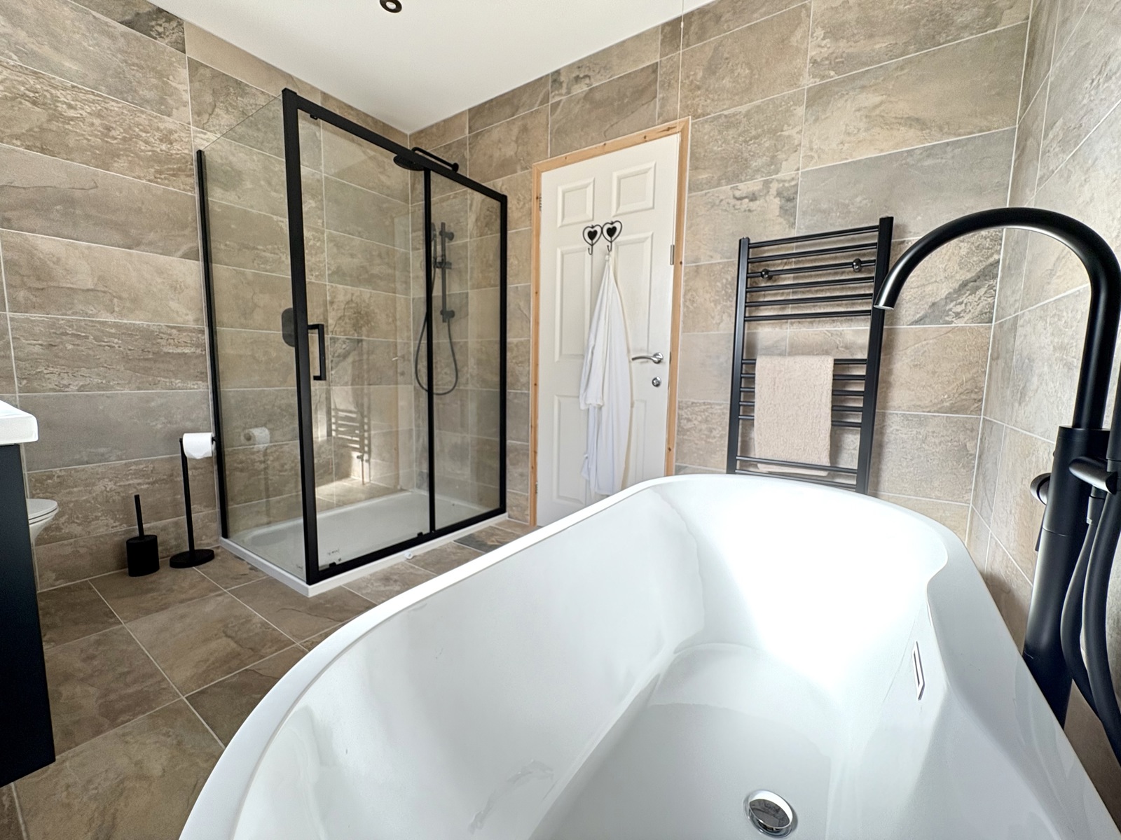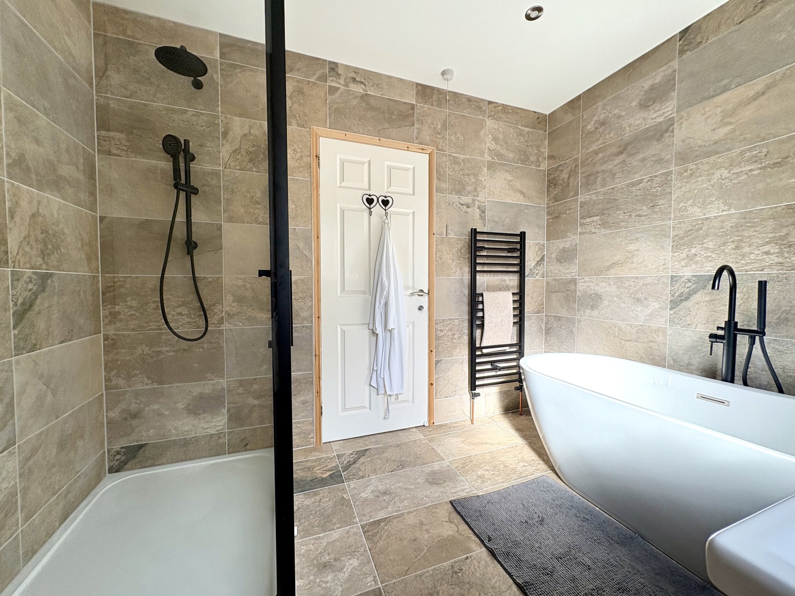 Tile flooring, tiled walls, Shower, bath, WC, wash hand basin, heated towel rail, double glazed uPVC window.