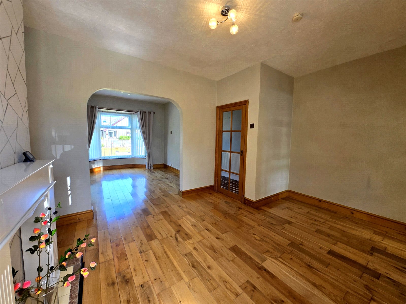 This impressive living and dining area is a highlight of the property, offering a spacious and versatile layout. The room is beautifully illuminated by natural light, streaming through a large bay window in the dining area and an additional window in the living room, both dressed in elegant curtains. The living room features a striking fireplace with a patterned feature wall, creating a stylish focal point. The space is unified by a beautiful wooden floor that extends throughout, adding a touch of warmth and classic charm. An archway connects the living and dining spaces, creating a seamless flow, while a door with decorative glass panes leads to the hallway. A modern radiator ensures a comfortable living environment. This inviting room is perfect for both relaxing and entertaining.