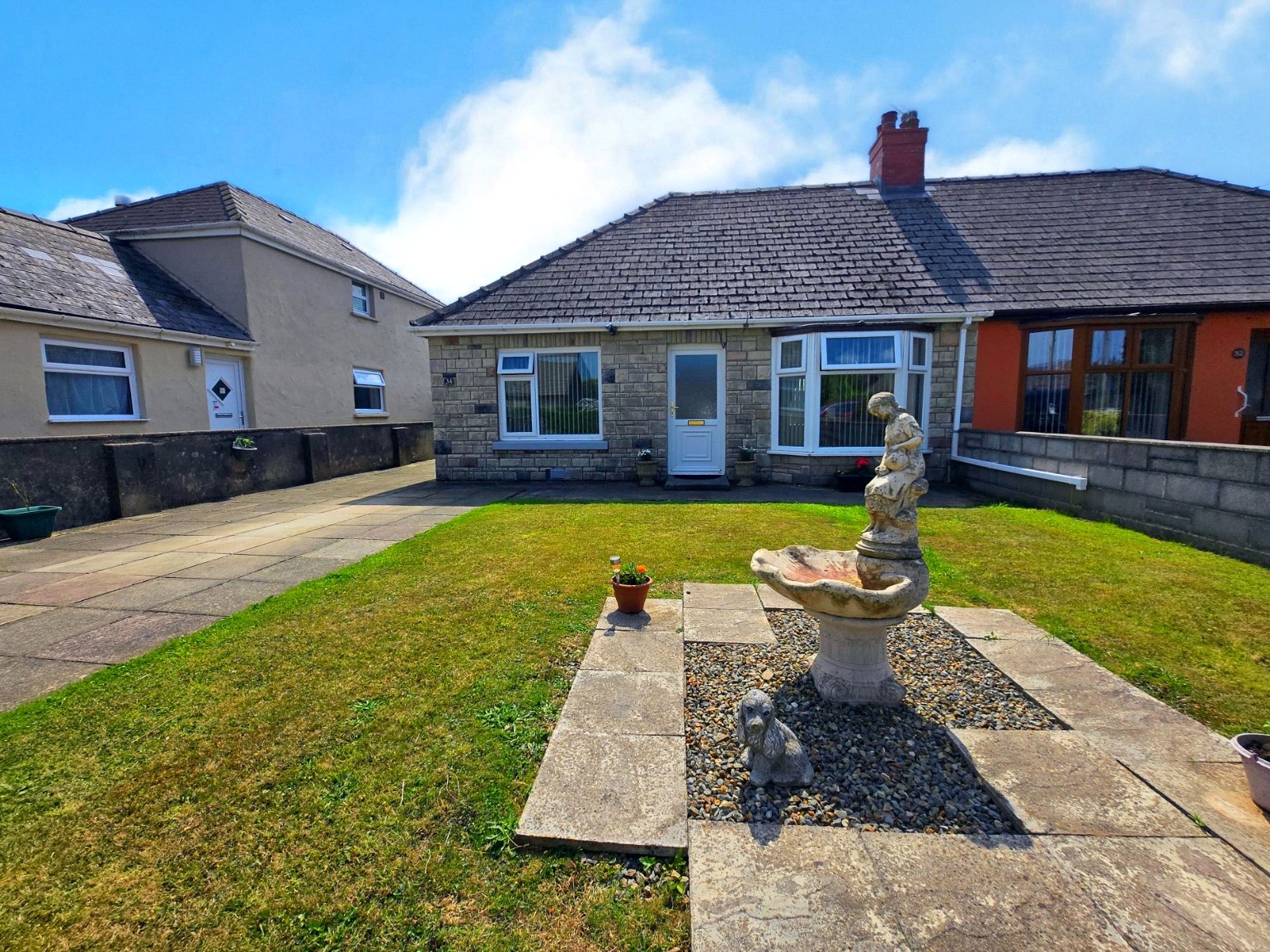 This charming bungalow offers an attractive and well-maintained exterior. The front of the property features a well-manicured lawn with a decorative fountain as a centrepiece, and a paved driveway provides ample off-road parking. The rear of the property boasts a generously sized garden, predominantly laid to lawn, with a variety of mature shrubs and planting beds, creating a private and peaceful outdoor space. There is a patio area, perfect for outdoor dining and entertaining, and a garden shed and multiple outbuildings for additional storage. The property's exterior is a lovely blend of practical features and aesthetic appeal, perfect for those who enjoy outdoor living.