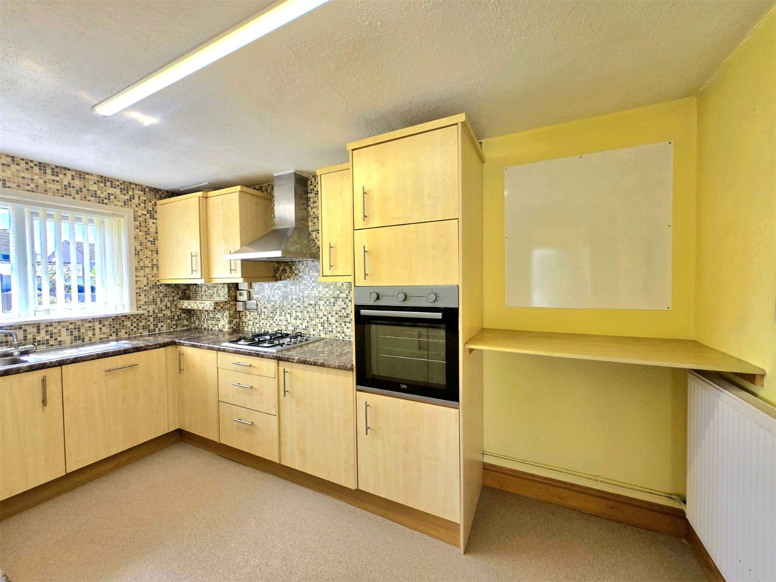 This spacious and functional kitchen is designed for practicality and style. It features a range of light wood-effect wall and base units, providing ample storage, complemented by sleek, modern T-bar handles. The dark, marble-effect laminate worktops offer a striking contrast and are easy to maintain. A stylish mosaic tiled splashback adds a contemporary touch and runs along the entire length of the kitchen. The kitchen is well-equipped with a gas hob, an integrated oven, an overhead extractor fan, an integrated fridge, an integrated freezer, a dishwasher, and a washing machine. There is a built-in stainless-steel sink with a mixer tap positioned below a large window, which allows for plenty of natural light. The room also benefits from additional shelving and a practical space for a breakfast bar or small dining area. The flooring is a neutral, easy-to-clean vinyl, making this a perfect space for everyday living.