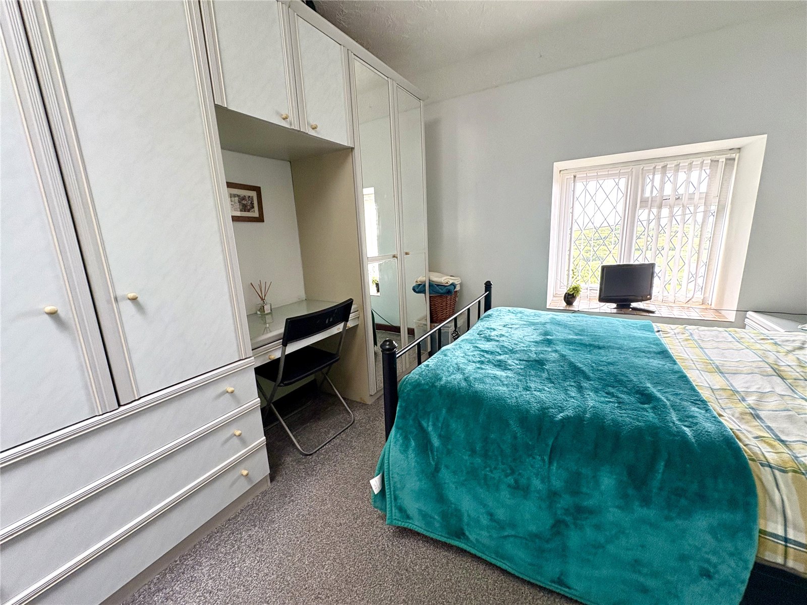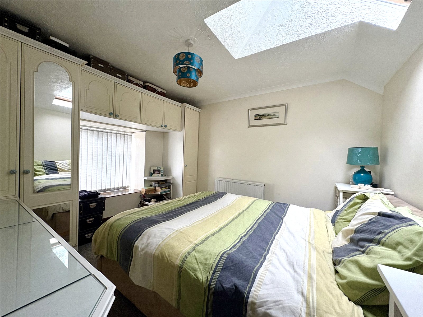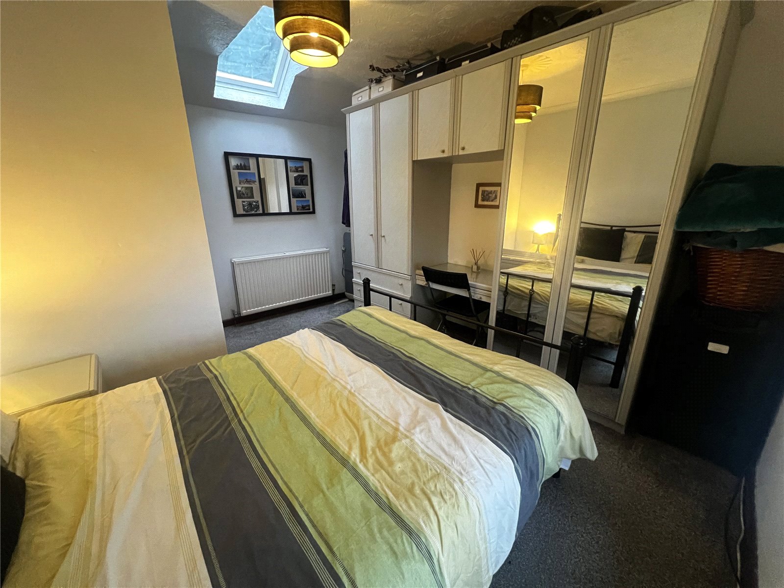 The room is well presented with carpeted flooring and offers generous storage via a fitted wardrobe. Natural light is a key feature, provided by both a skylight and a uPVC double-glazed window, creating a bright and welcoming atmosphere throughout the day. The space is further enhanced by a fitted radiator.