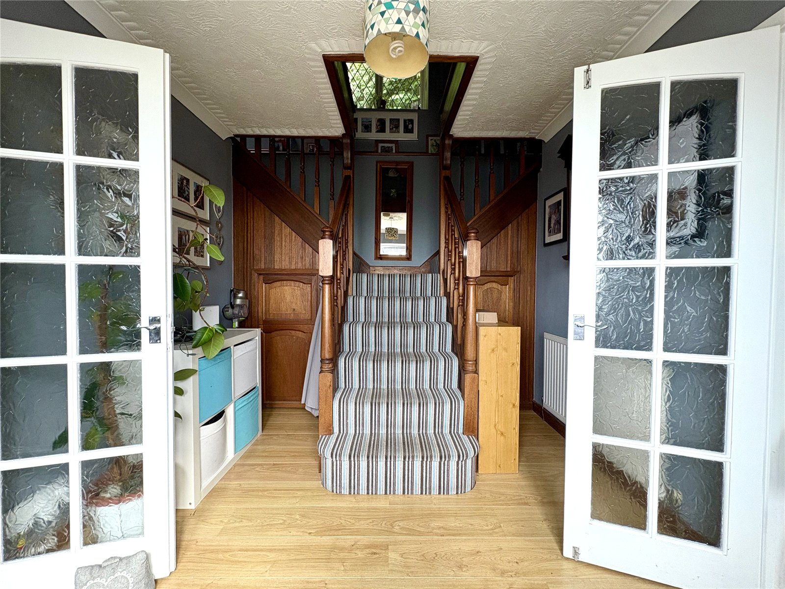 The entrance hall features durable LVT flooring and a uPVC double-glazed front door, with stairs rising to the first floor making a grande entrance with useful storage beneath. The space is further complemented by a fitted radiator.