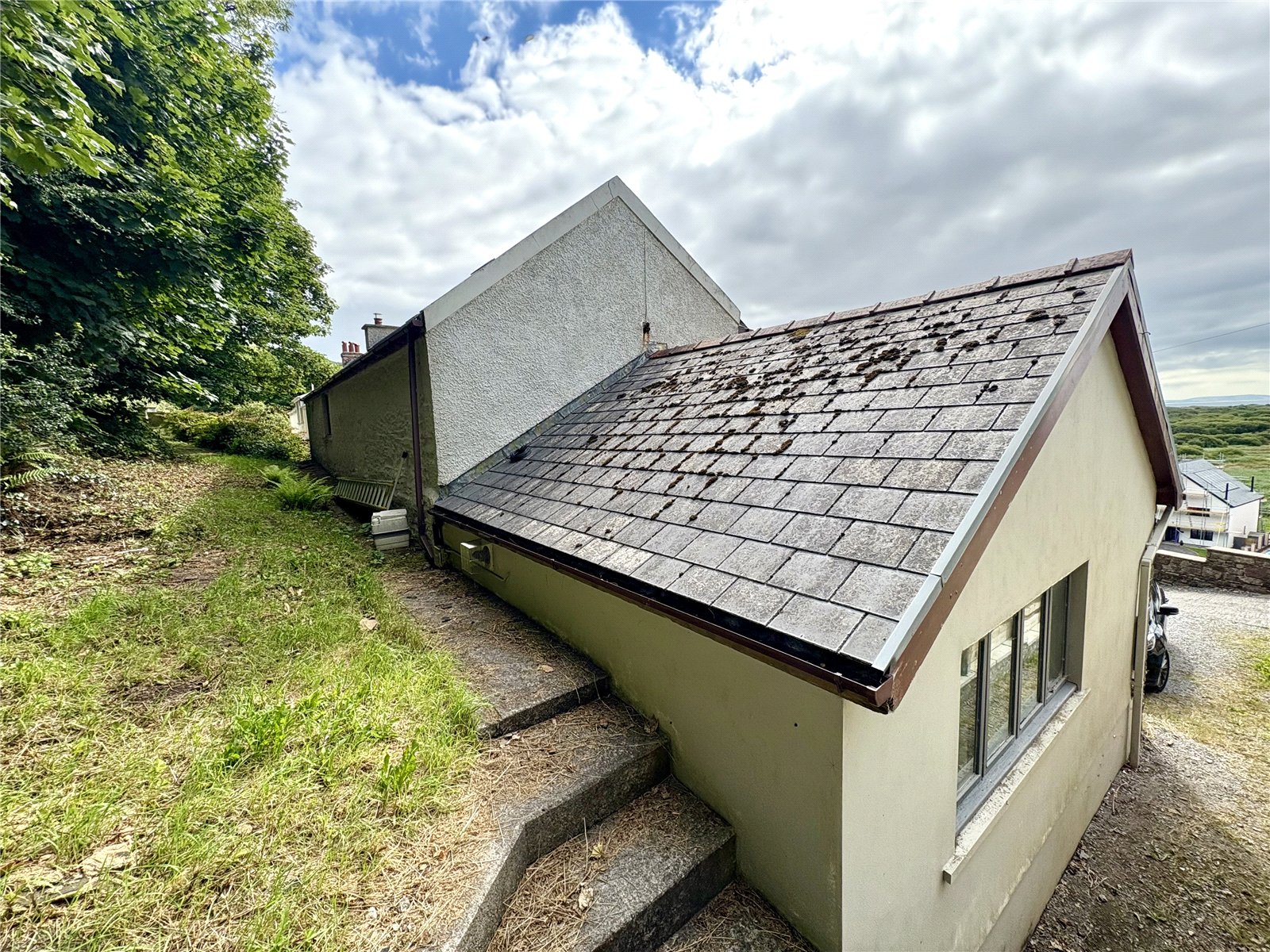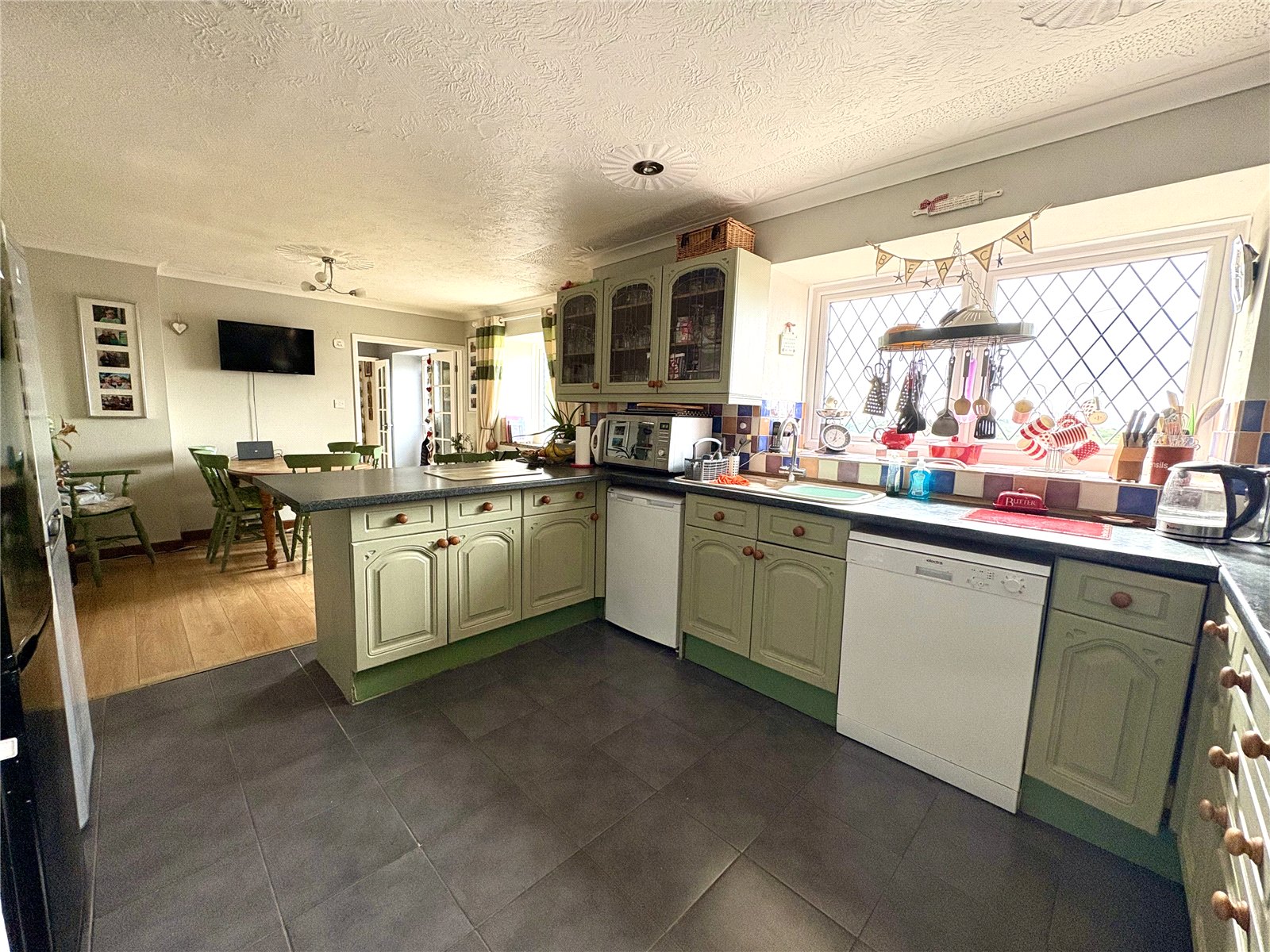 The kitchen is fitted with a range of base and eye-level units and benefits from a combination of LVT and tiled flooring. Additional features include a sink and drainer with tiled splashback, an oven and hob, and space for a dishwasher and fridge freezer. The room is well lit by two uPVC double-glazed windows and is further complemented by two radiators. Further featuring panarmic views of the coastline.