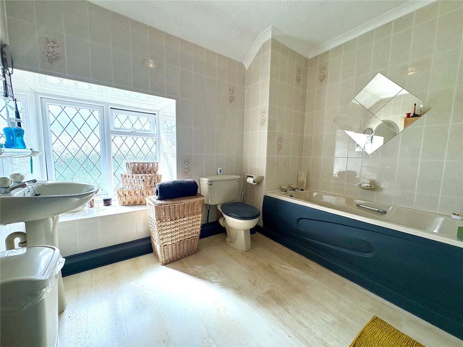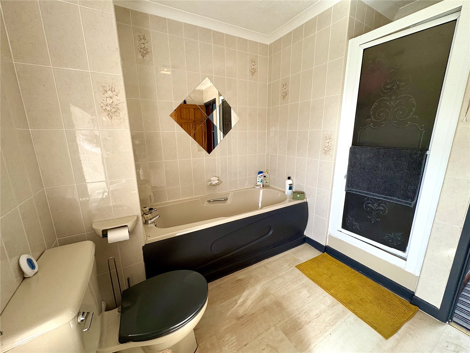 The bathroom is fitted with vinyl flooring and comprises a bath with shower over, WC and wash hand basin. The room benefits from fully tiled walls and a uPVC double-glazed window providing natural light.