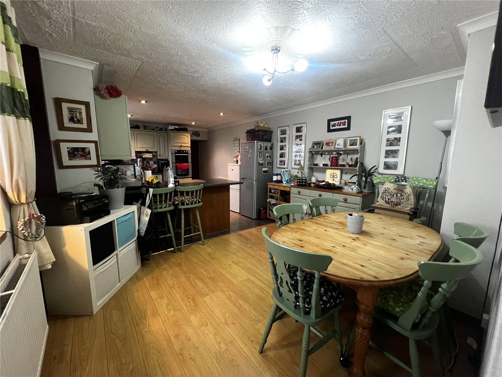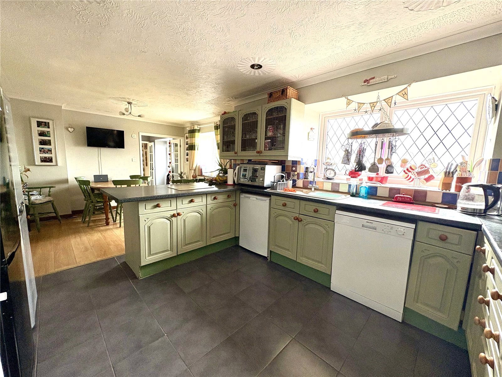 Showcasing panoramic views of the coastline, the kitchen is fitted with a range of base and eye-level units and benefits from a combination of LVT and tiled flooring. Additional features include a sink and drainer with tiled splashback, an oven and hob and space for a dishwasher and fridge freezer. The room is well lit by two uPVC double-glazed windows and is further complemented by two radiators.