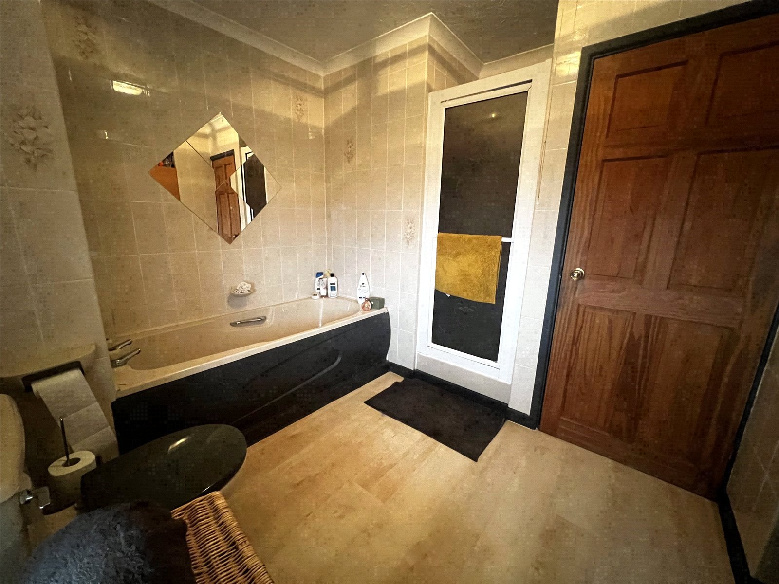 The bathroom is fitted with vinyl flooring and comprises a bath and separate shower cubicle, WC and wash hand basin. The room benefits from fully tiled walls and a uPVC double-glazed window providing natural light.