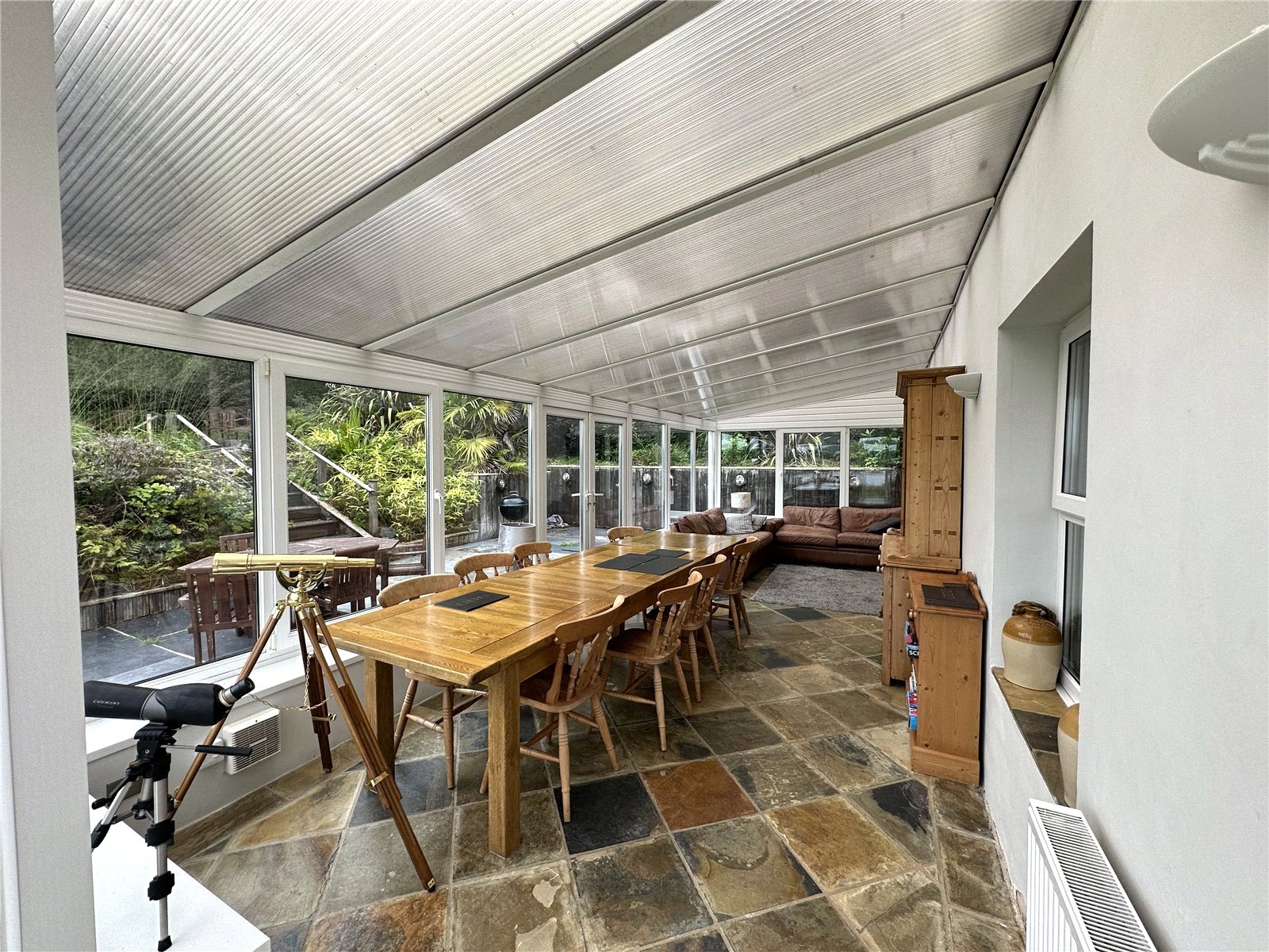 This expansive conservatory serves as a versatile living and dining hub, featuring rustic flagstone flooring and wrap-around glazing that provides panoramic views of the water and surrounding greenery. The space offers direct access to the garden terrace, creating a seamless indoor-outdoor flow perfect for entertaining or quiet relaxation.