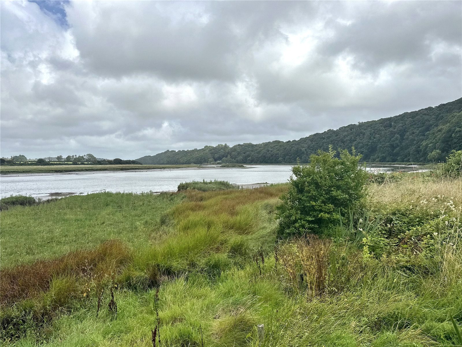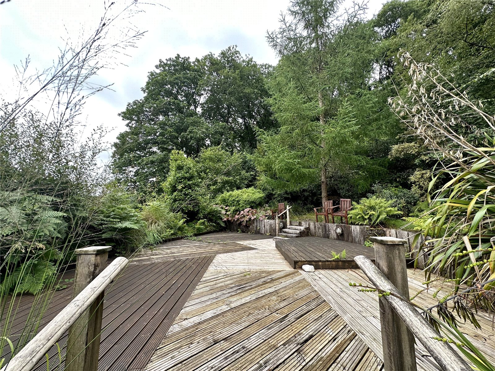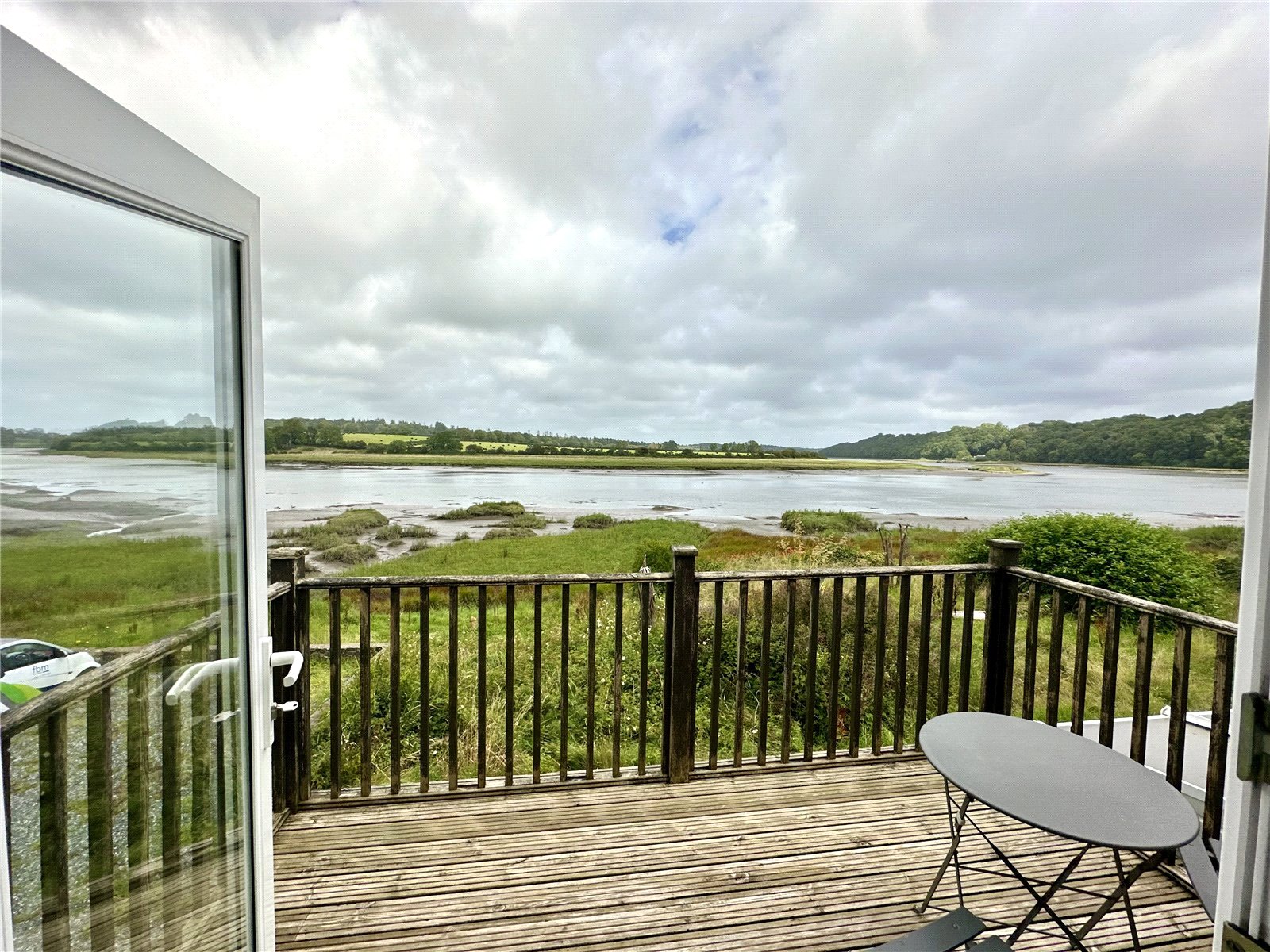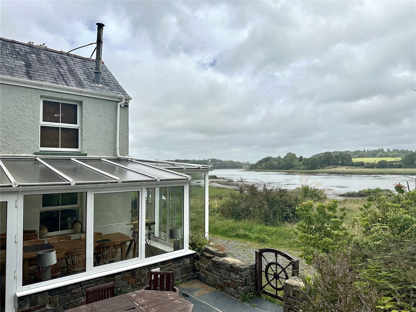 This charming home features a light-green rendered facade and an elevated private balcony that captures breathtaking panoramic views of the stunning, uninterrupted water views over the Cleddau Estuary. The extensive outdoor living space includes a large stone patio and a multi-level timber deck, providing a tranquil vantage point nestled against a lush, wooded backdrop.