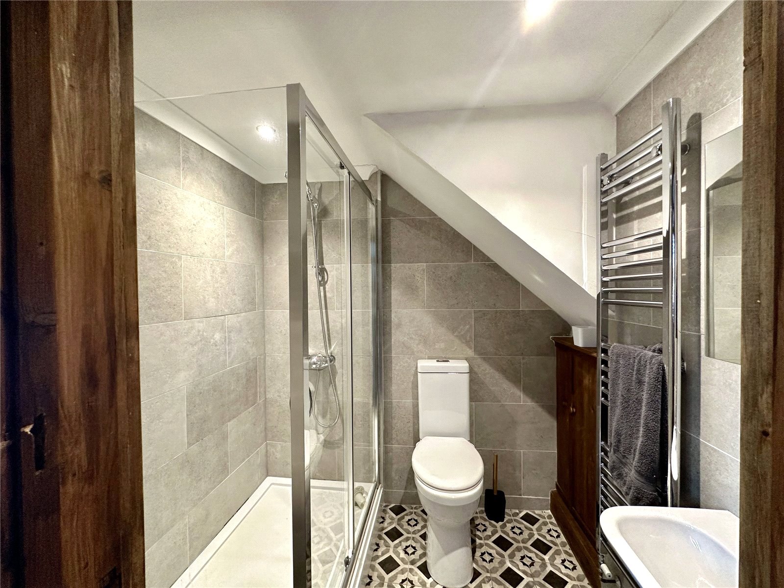This stylish contemporary shower room features elegant stone-effect wall tiling and striking monochrome geometric flooring that complements its unique architectural layout. The space is thoughtfully designed to maximize the footprint, incorporating a glass-enclosed walk-in shower and a bespoke vanity unit neatly nestled beneath the sloped ceiling.