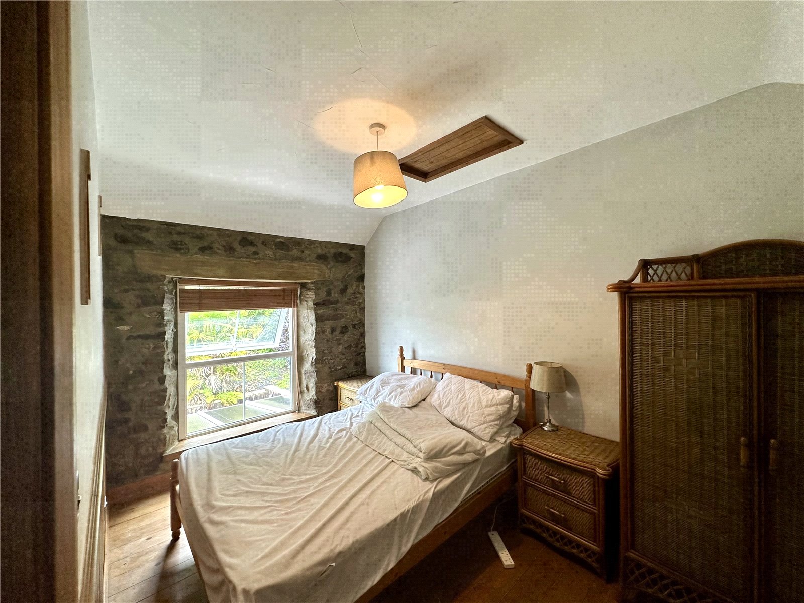 This charming and versatile bedroom features an authentic exposed stone wall and natural timber flooring that create a warm, cozy atmosphere. Its intimate proportions and tranquil garden views make it an ideal space for a guest room, a quiet home office, or a peaceful nursery.