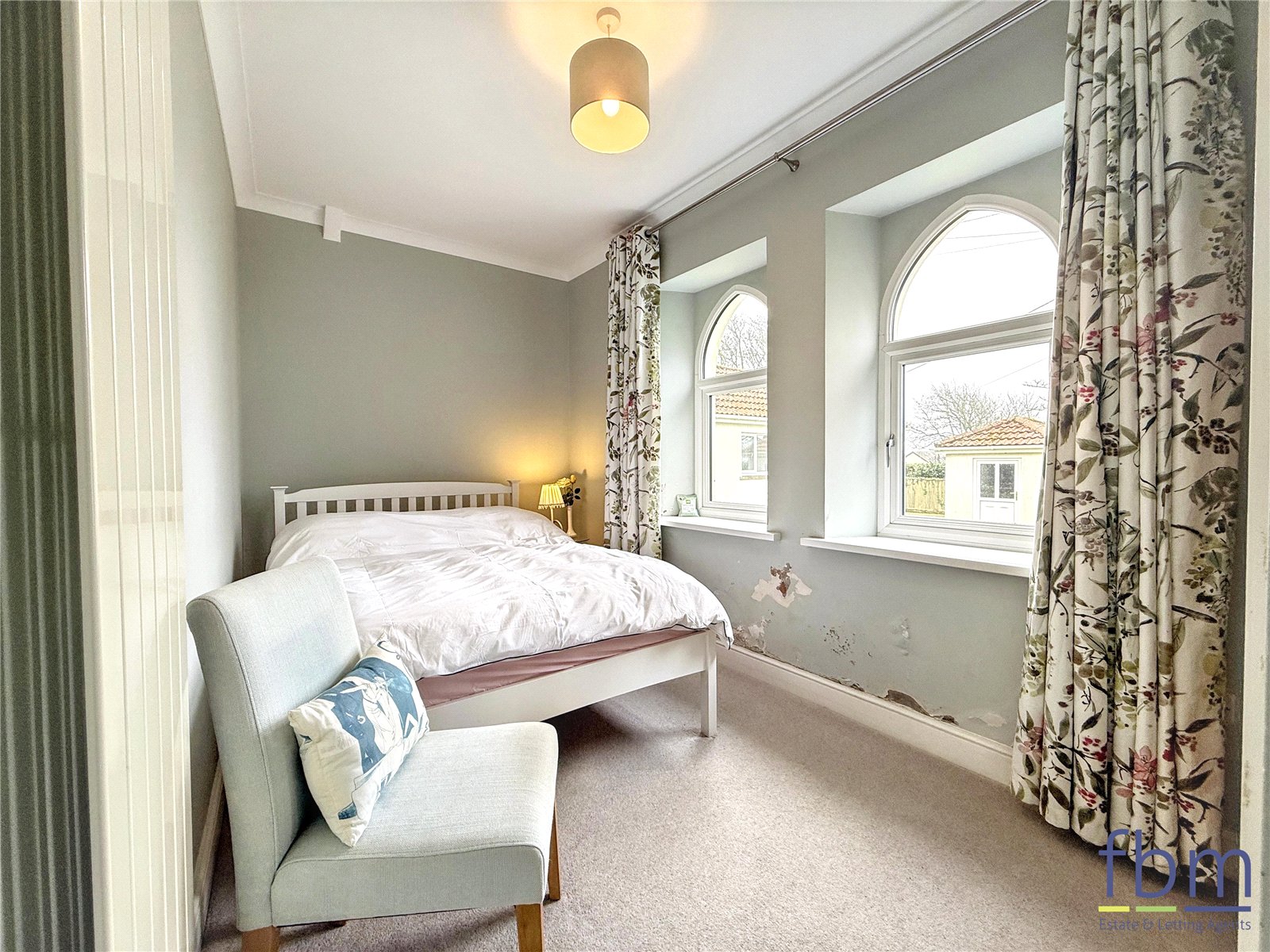 Carpeted bedroom featuring fitted wardrobes, two uPVC church-style windows, and a radiator.