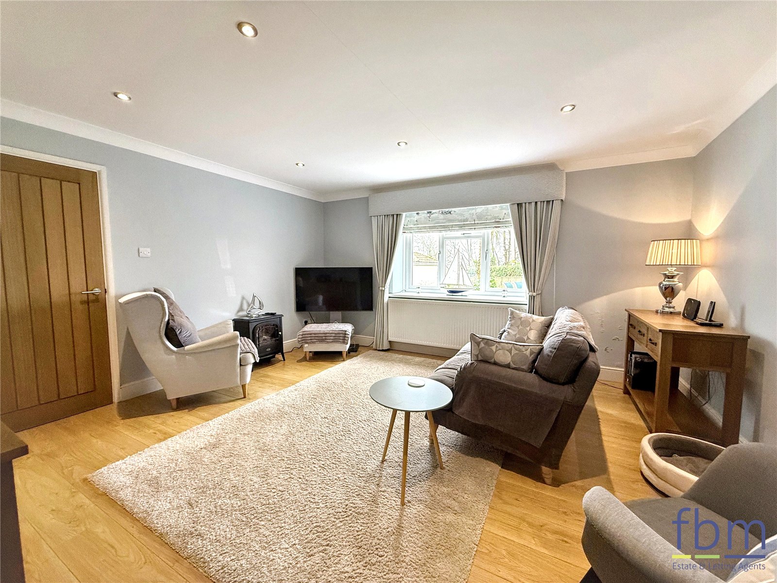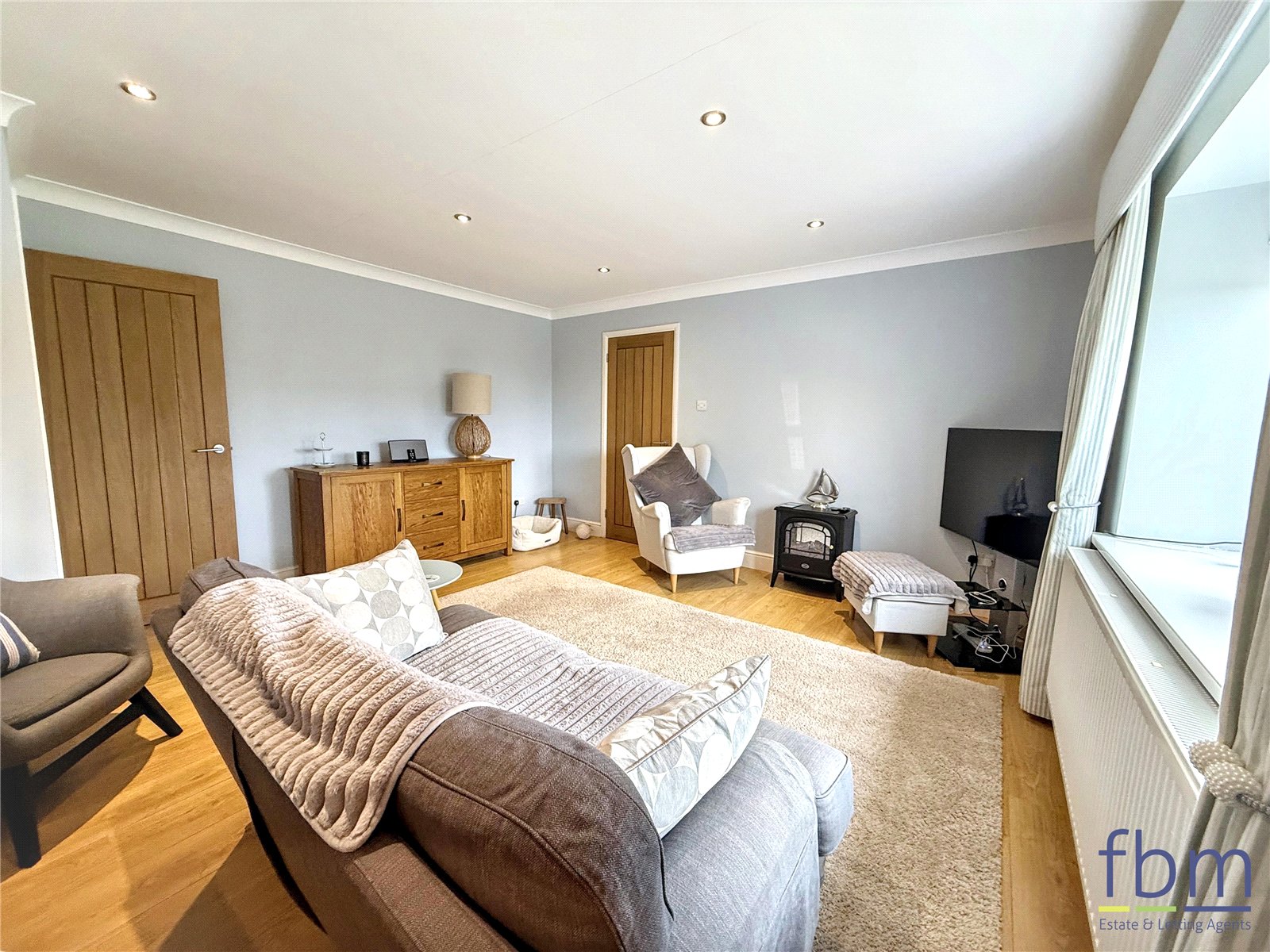 Laminate flooring, upvc front window, Radiator, spot lights and a glimpse of the sea.