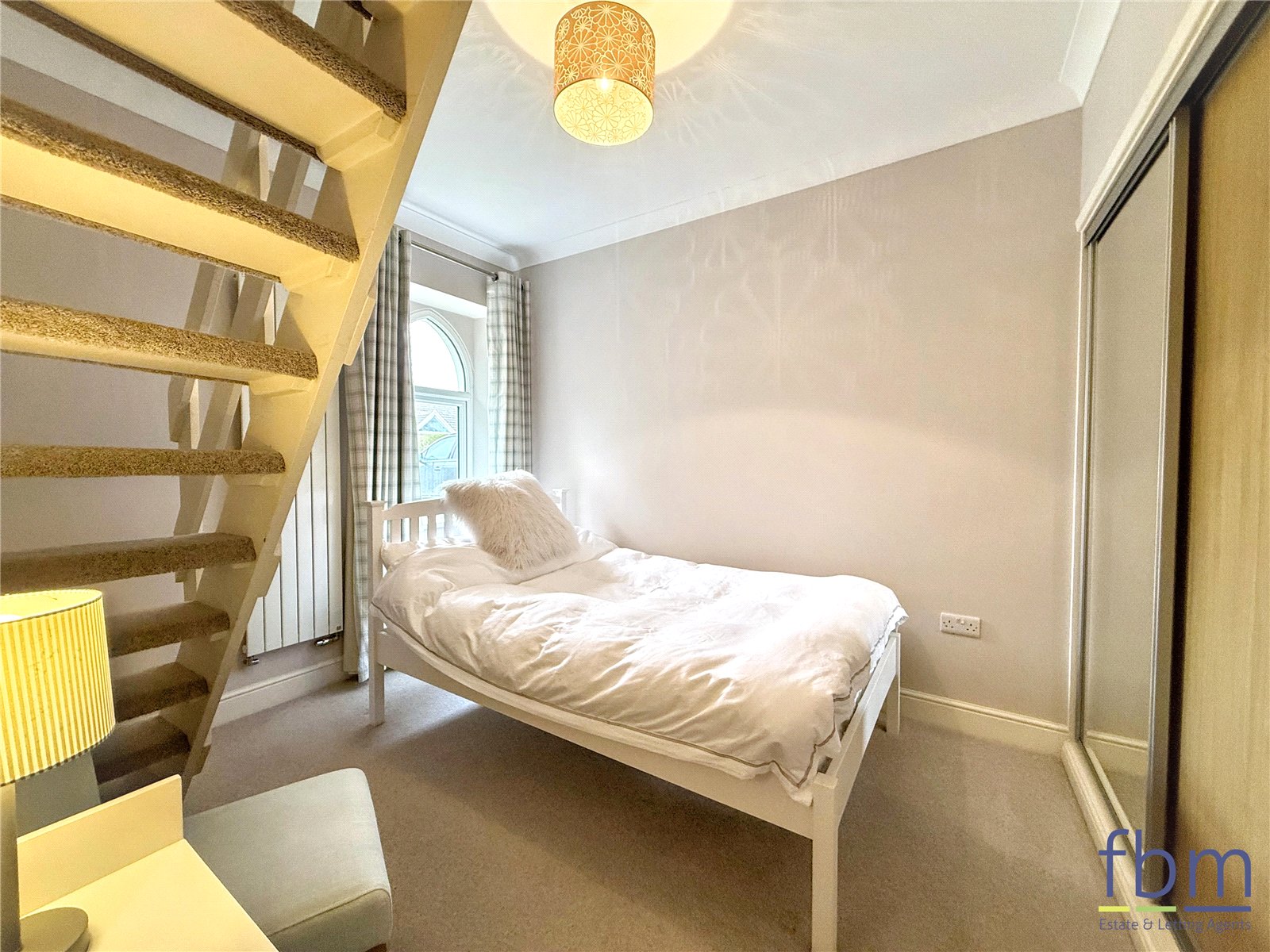 Carpeted bedroom with a fitted wardrobe, a uPVC church-style window, stairs leading to the loft room, and a radiator.