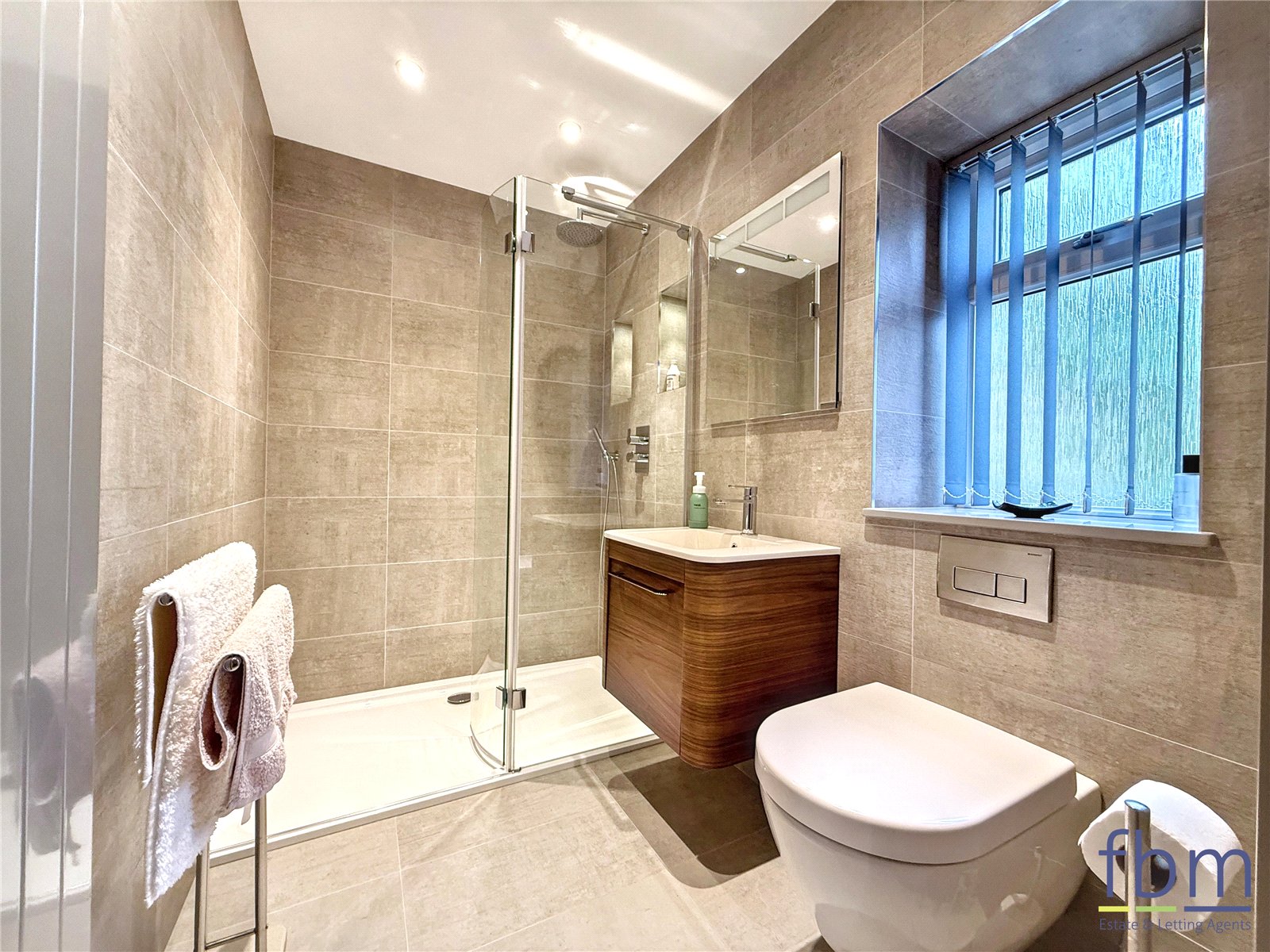 Fully tiled shower room with underfloor heating, featuring a walk-in shower with glass screen, recessed shelving with lighting, a wash hand basin set into a wall-mounted vanity unit, WC with a hidden cistern. Additional features include an upright radiator, uPVC window, and an extractor fan.