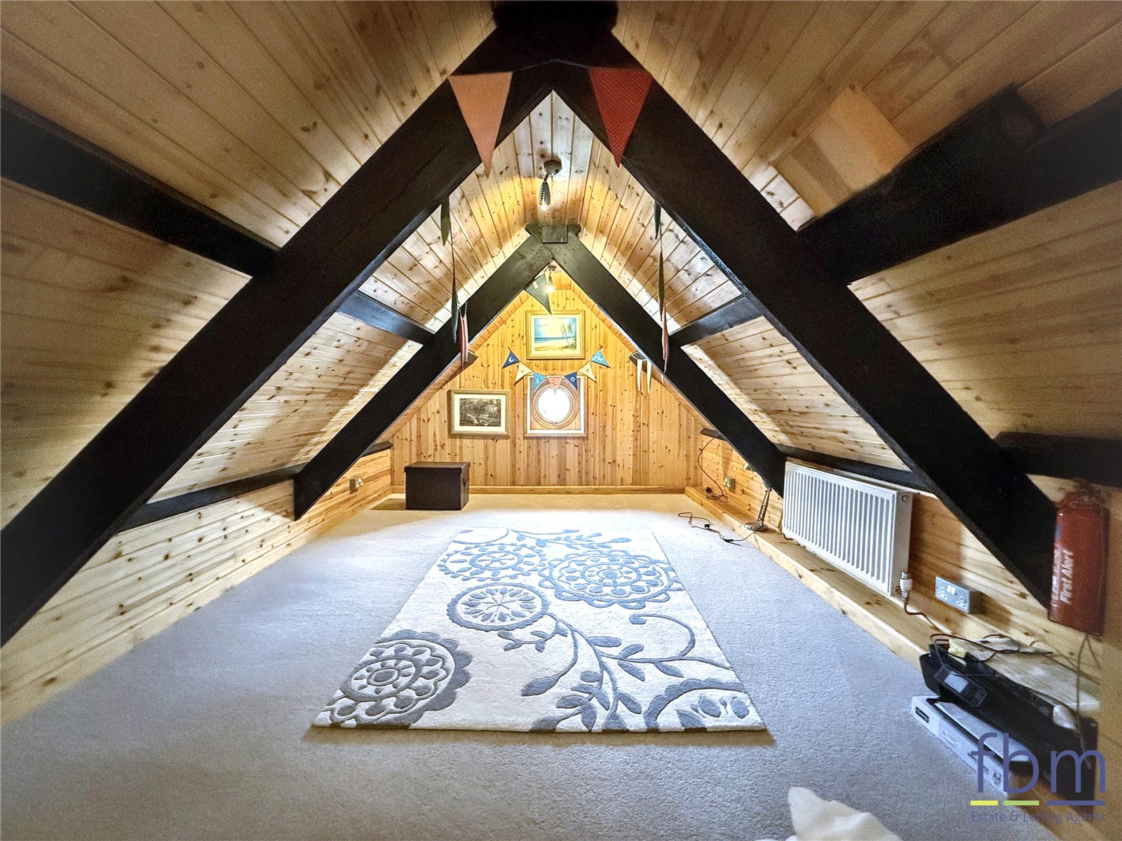 Carpeted loft room with a porthole window and a radiator.