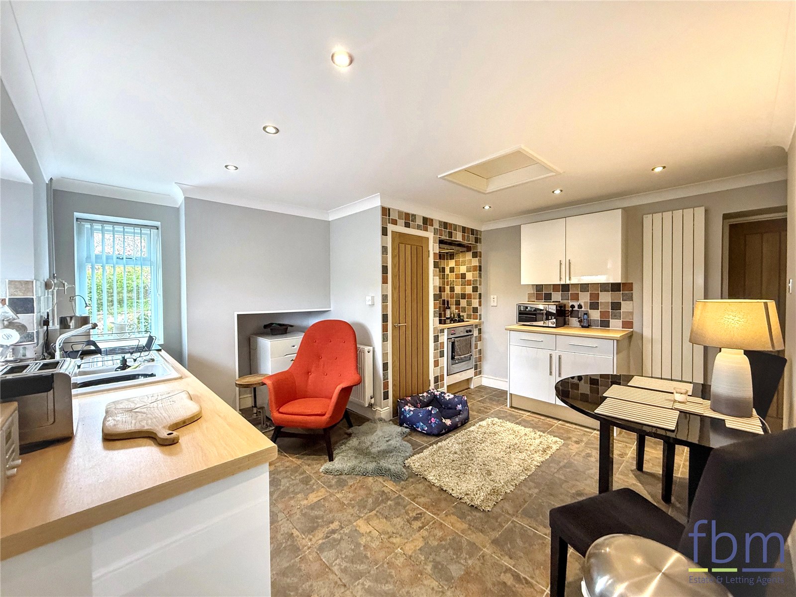 Fitted with a range of wall and base units incorporating a ceramic sink and drainer, complemented by tiled splashbacks. The kitchen includes an integrated oven and hob, with space for a freestanding dishwasher and fridge. Further features include two radiators, two uPVC windows, a composite front door, tiled flooring, a useful storage cupboard, with spot lighting throughout.