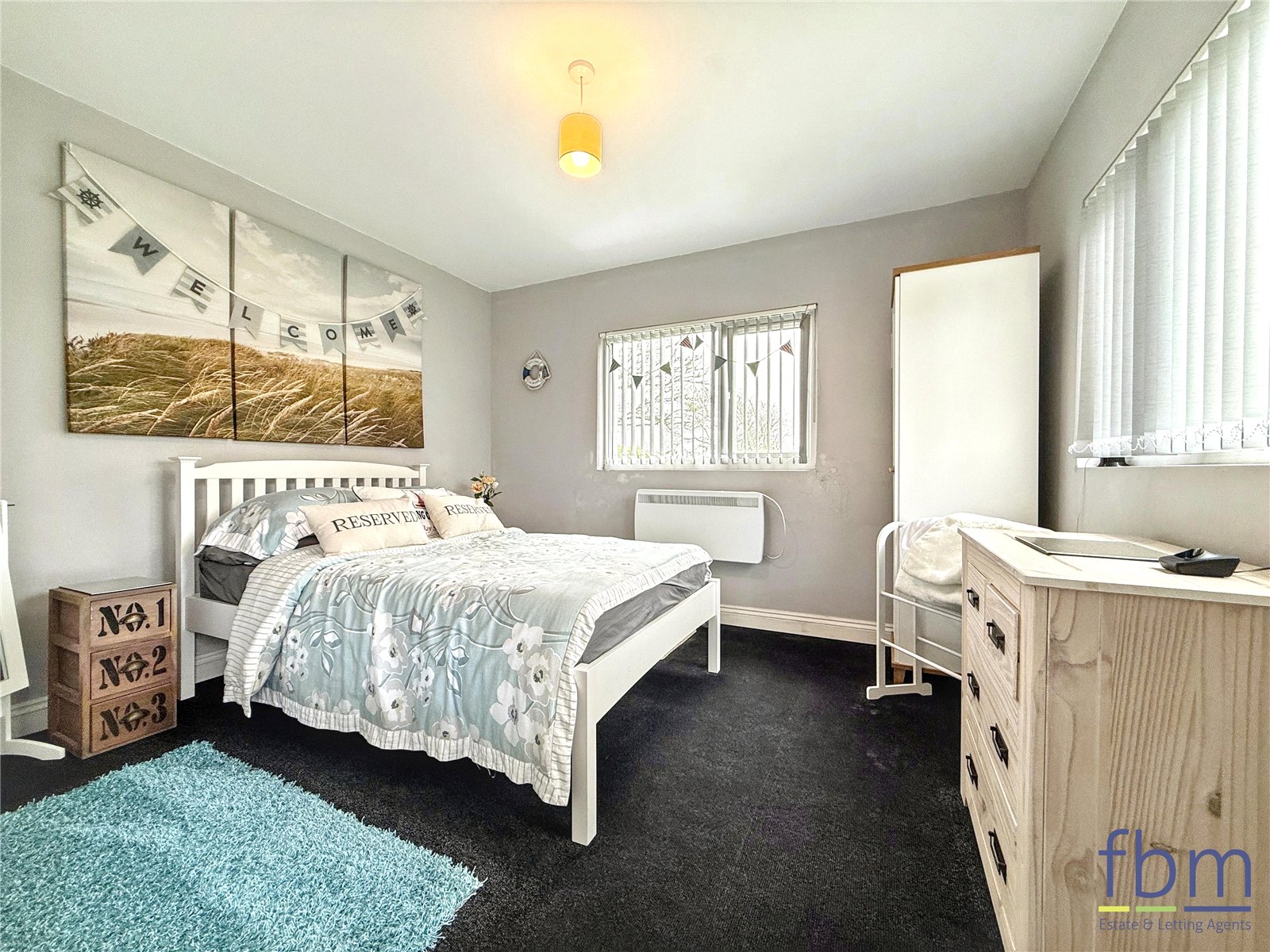 Carpeted bedroom with an electric radiator, two uPVC windows, and a glimpse of the sea.