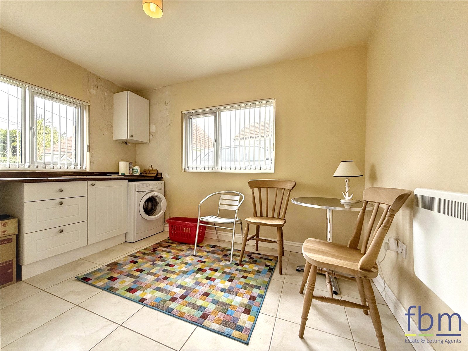 Versatile space, currently arranged as a lounge area, featuring base-mounted units, plumbing for freestanding appliances, tiled flooring, an electric radiator, and two uPVC windows.