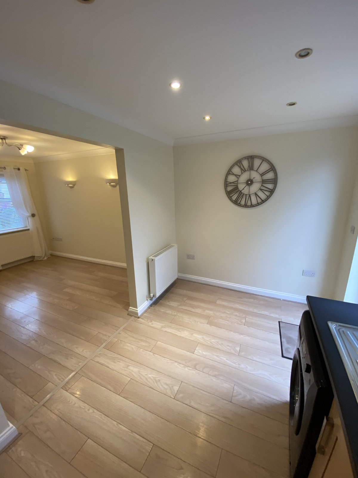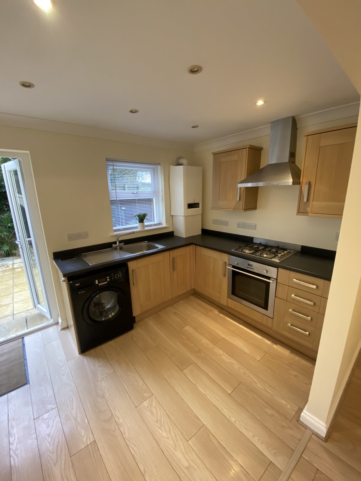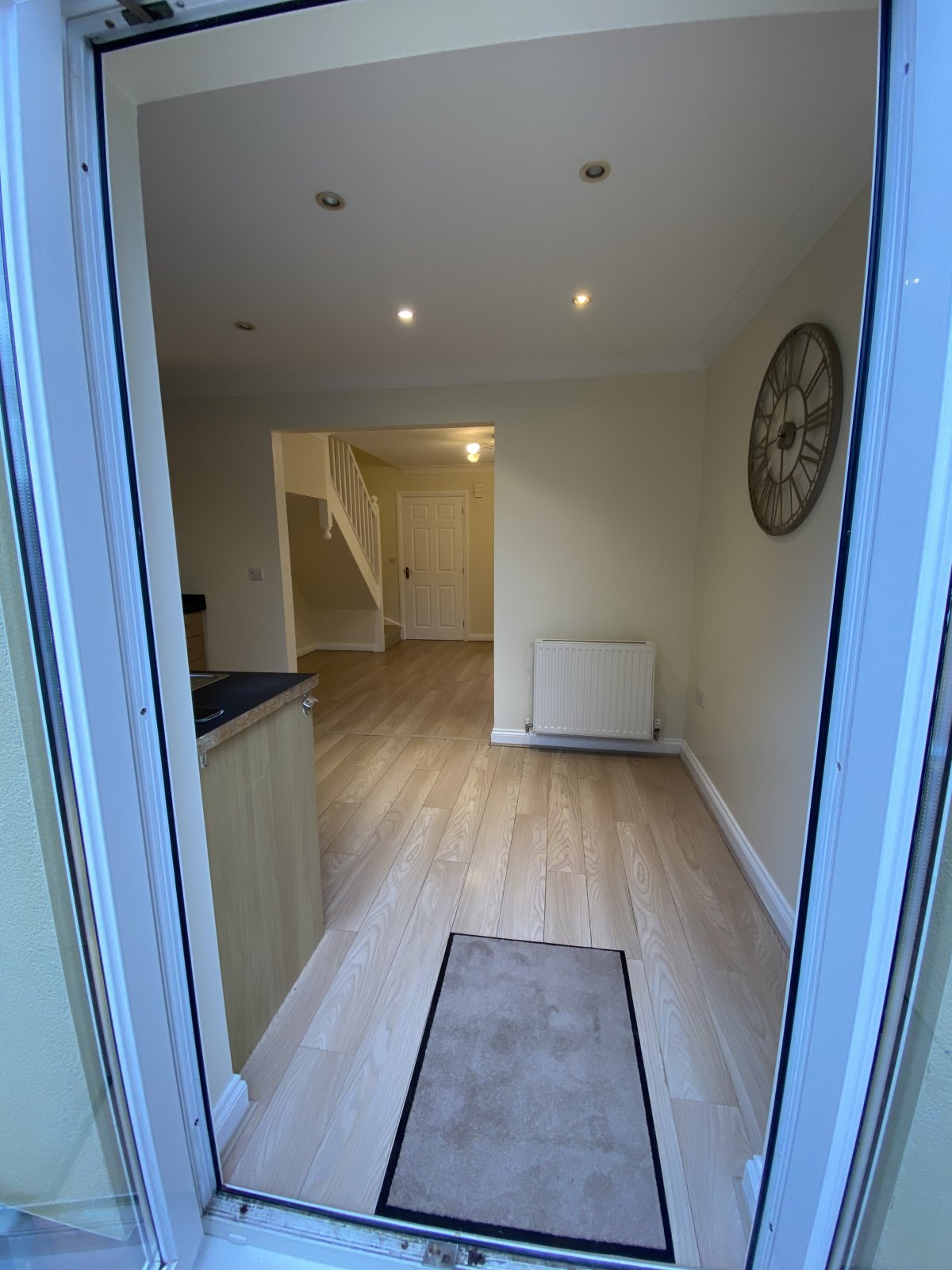 Good size fitted kitchen, recently redecorated, laminate flloring, fitted wall & base units with intergrated electric oven and gas hobb,fridge, space for washing machine. Pleanty of electric sockets, recessed ceiling spotlights. UPVC double patio doors leading to enclosed rear garden.
