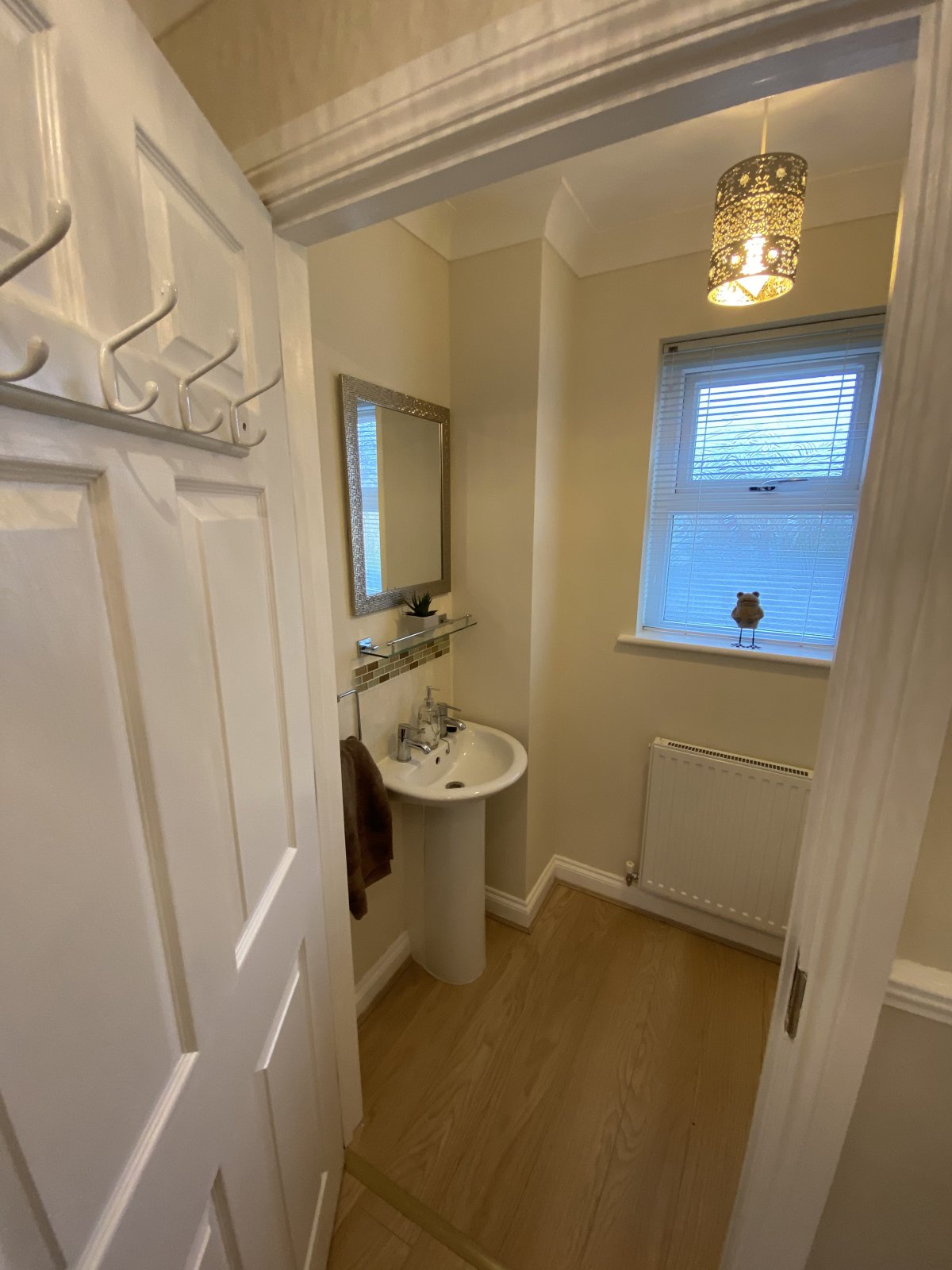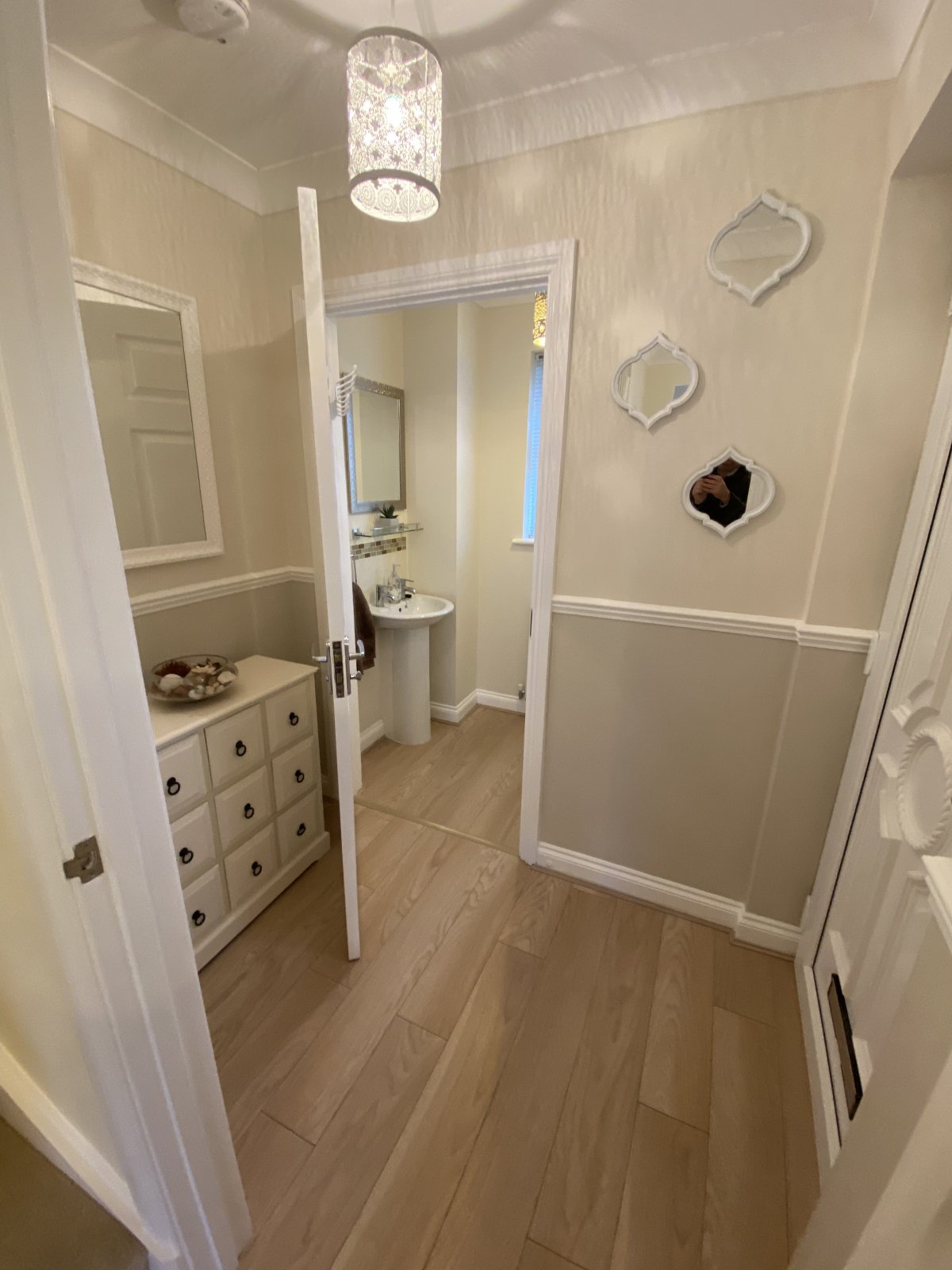 Front UPVC door leading into internal porchway. Laminate flooring, radiator, lightfitting, freshly painted walls. Door leading to cloakroom/toilet.
