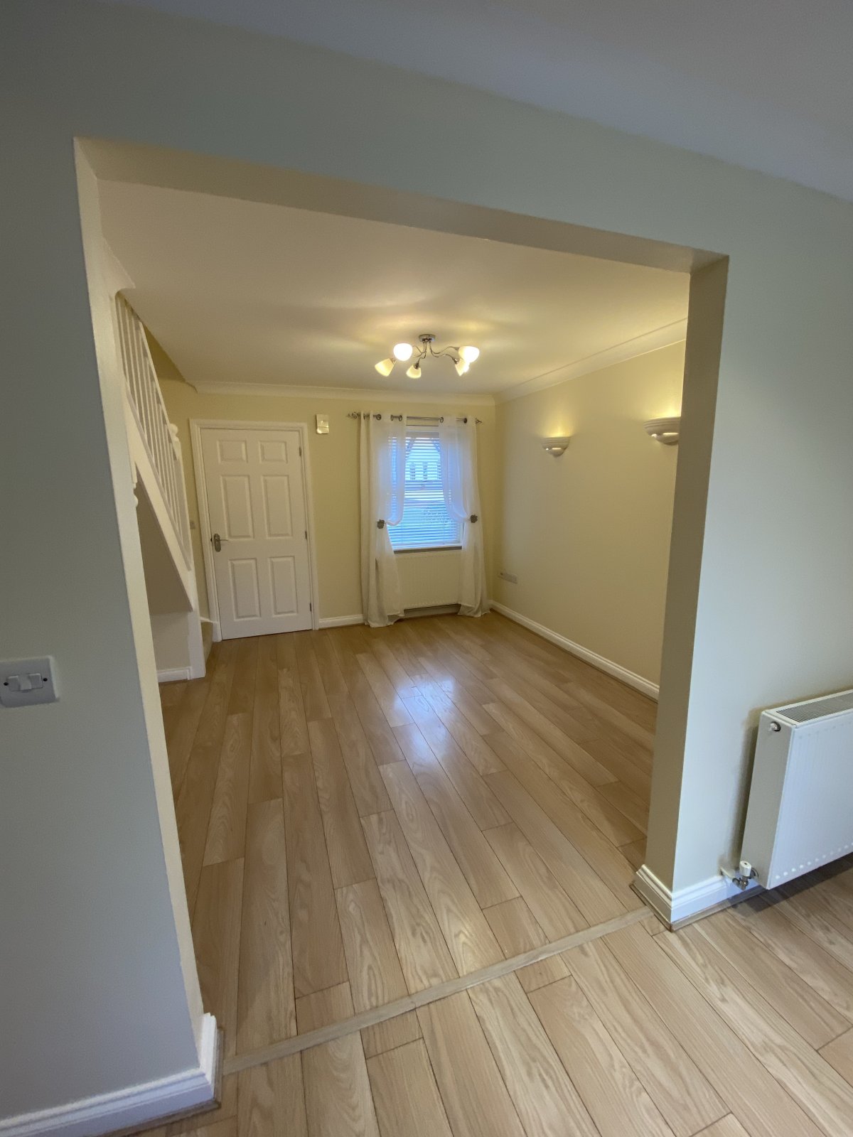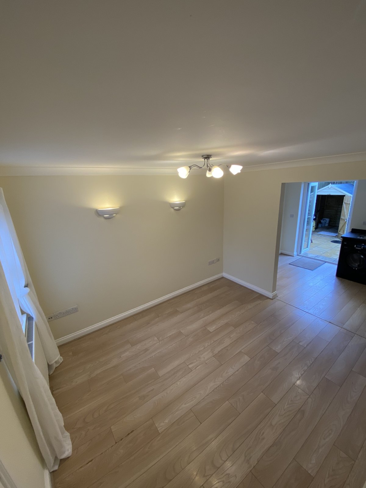 Good size living room with grey laminate flooring, UPVC window light fitting, freshly painted walls and ceiling, light fitting.