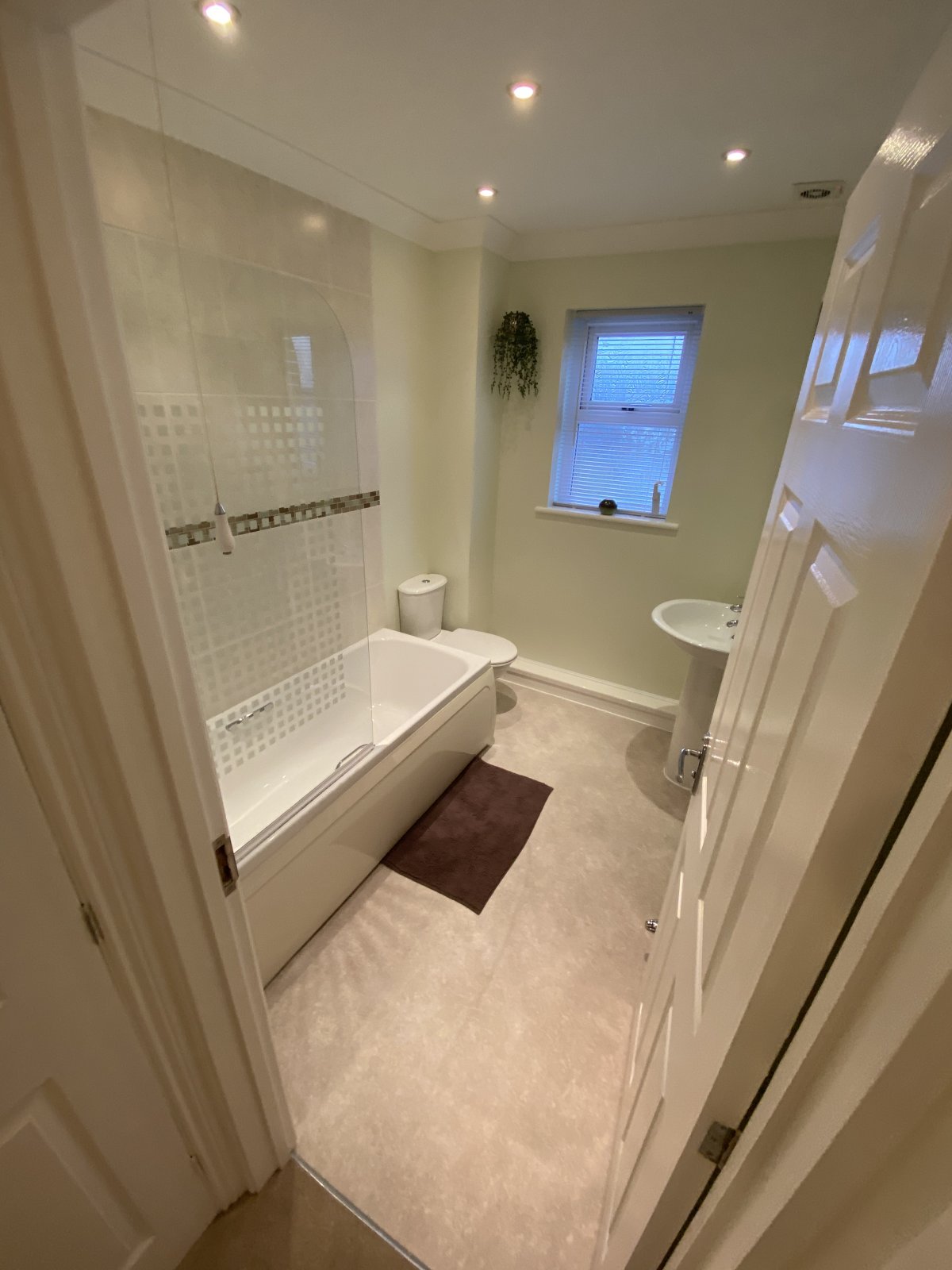 Recessed ceiling spotlights, white 3 piece bathroom suite, glass shower screen, power shower unit. Vynal flooring, Half tiling behind shower, UPVC window.