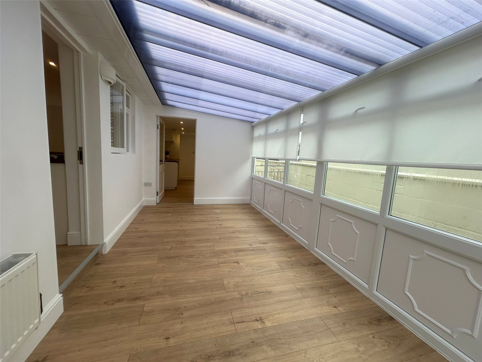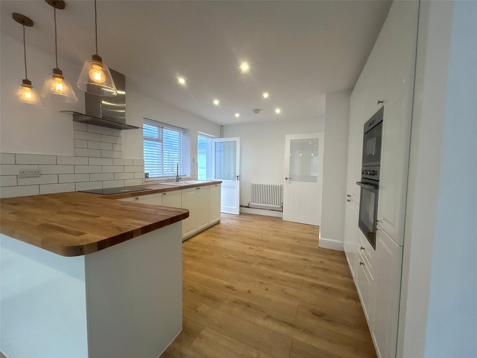 A brand new, unused kitchen fitted with fully integrated appliances and finished with laminate flooring. Double glazed windows to the side and front provide plenty of natural light. Additional features include a radiator, spot lighting, and direct access to the sunroom.