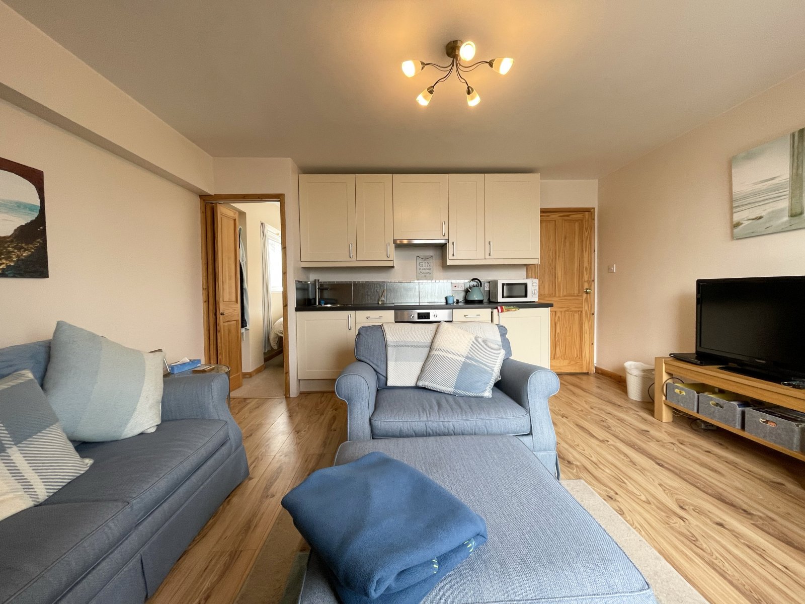 Laminate flooring, range of base and eye level units, integrated fridge, sink, electric hob and oven, large storage cupboard, uPVC double glazed window to fore with sea view.