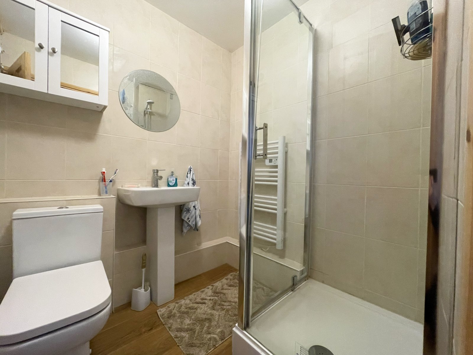 Laminate flooring, shower, WC, wash hand basin, airing cupboard with washing machine.