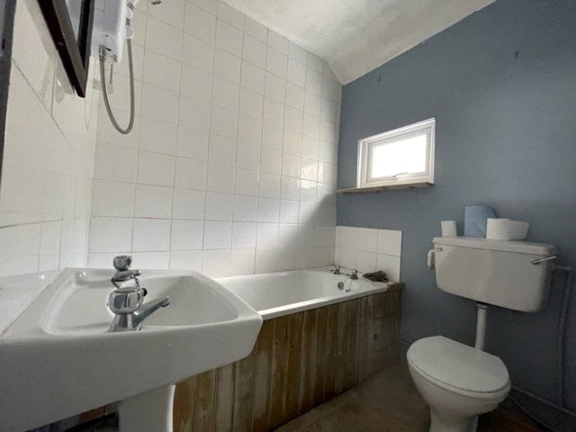 vinyl flooring, bath with shower over fully tiled, double glazed uPVC window to rear, wash hand basin, WC, electric fan heater