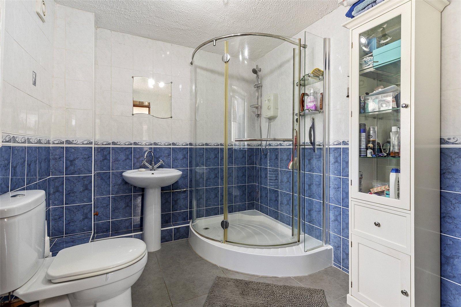 A well presented ground floor shower room featuring a practical layout with full tiling, creating a bright and easy to maintain space. The room offers a modern corner shower enclosure, good natural light and a neutral finish, making it a convenient addition to the home for guests or everyday use.
