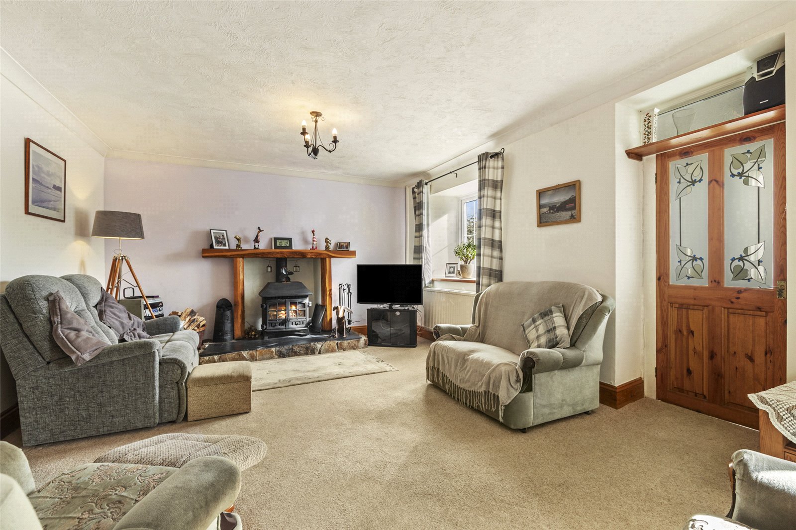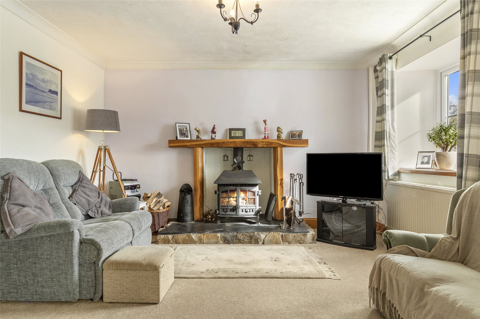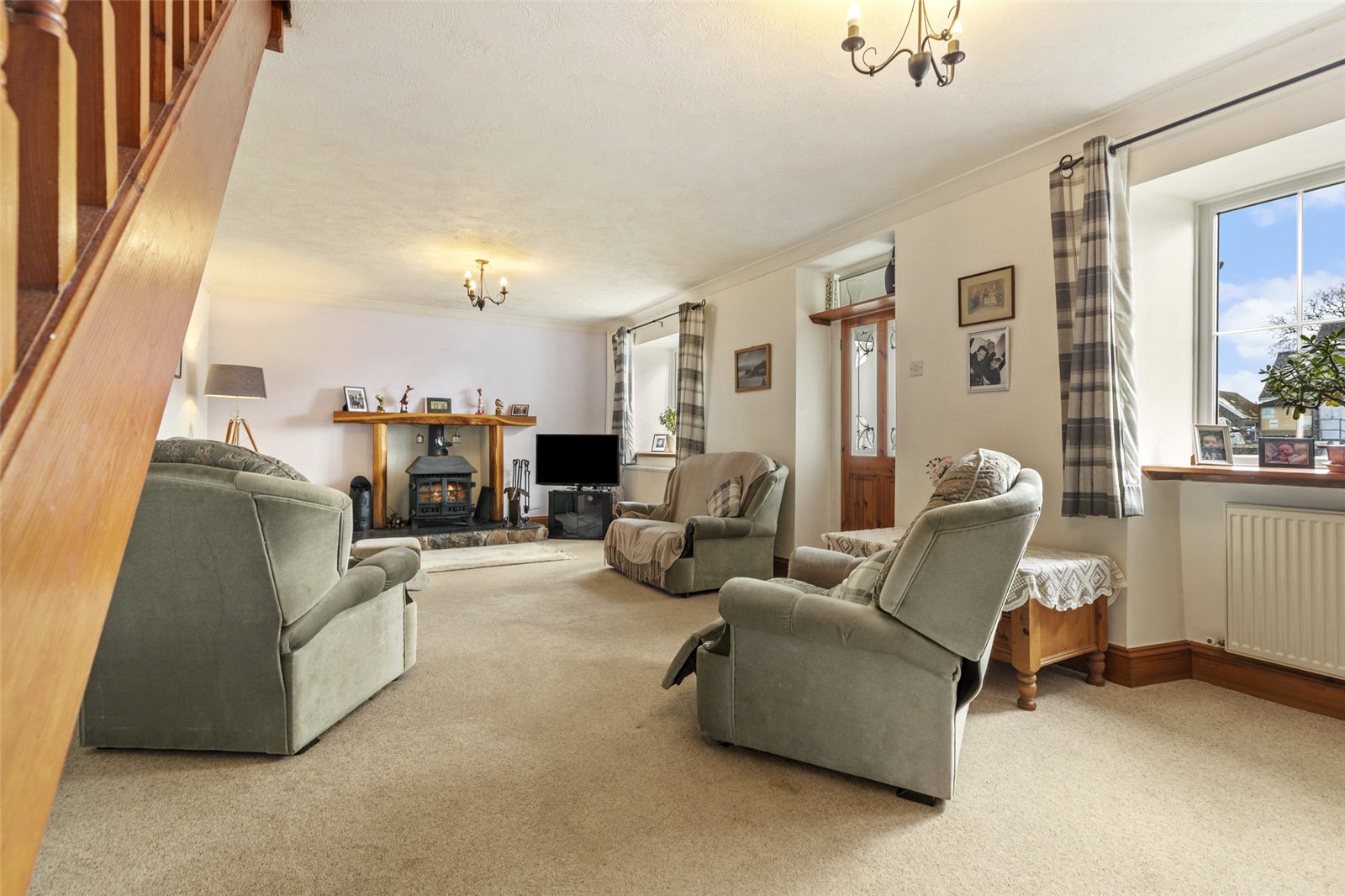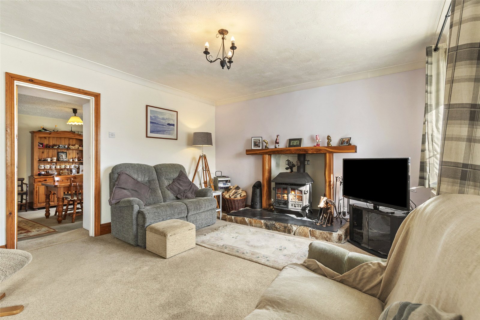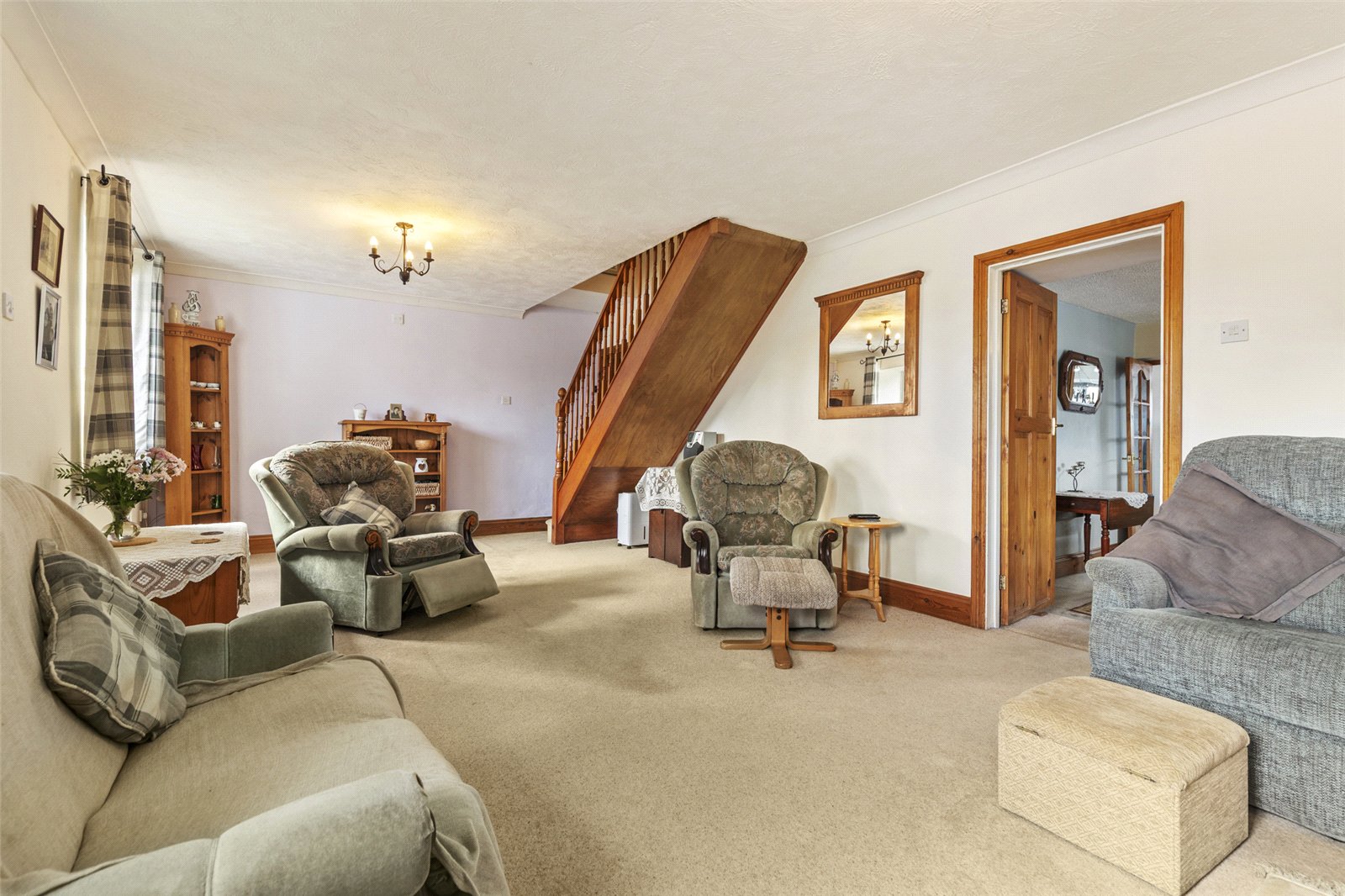A spacious and inviting lounge offering a warm, traditional feel, enhanced by soft neutral décor and generous natural light from multiple windows. The room features a central fireplace as a focal point, creating a cosy atmosphere, while the open layout provides plenty of flexibility for various seating arrangements. With its connection to the dining area and the staircase, this is a comfortable, well proportioned living space ideal for both relaxing and entertaining