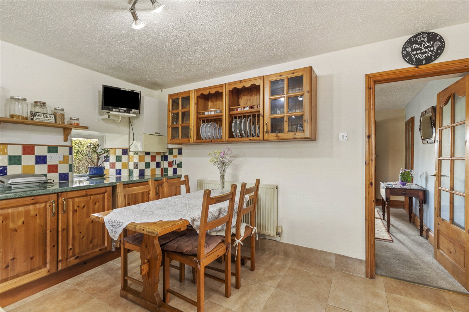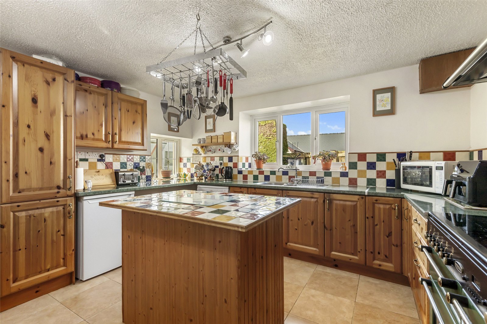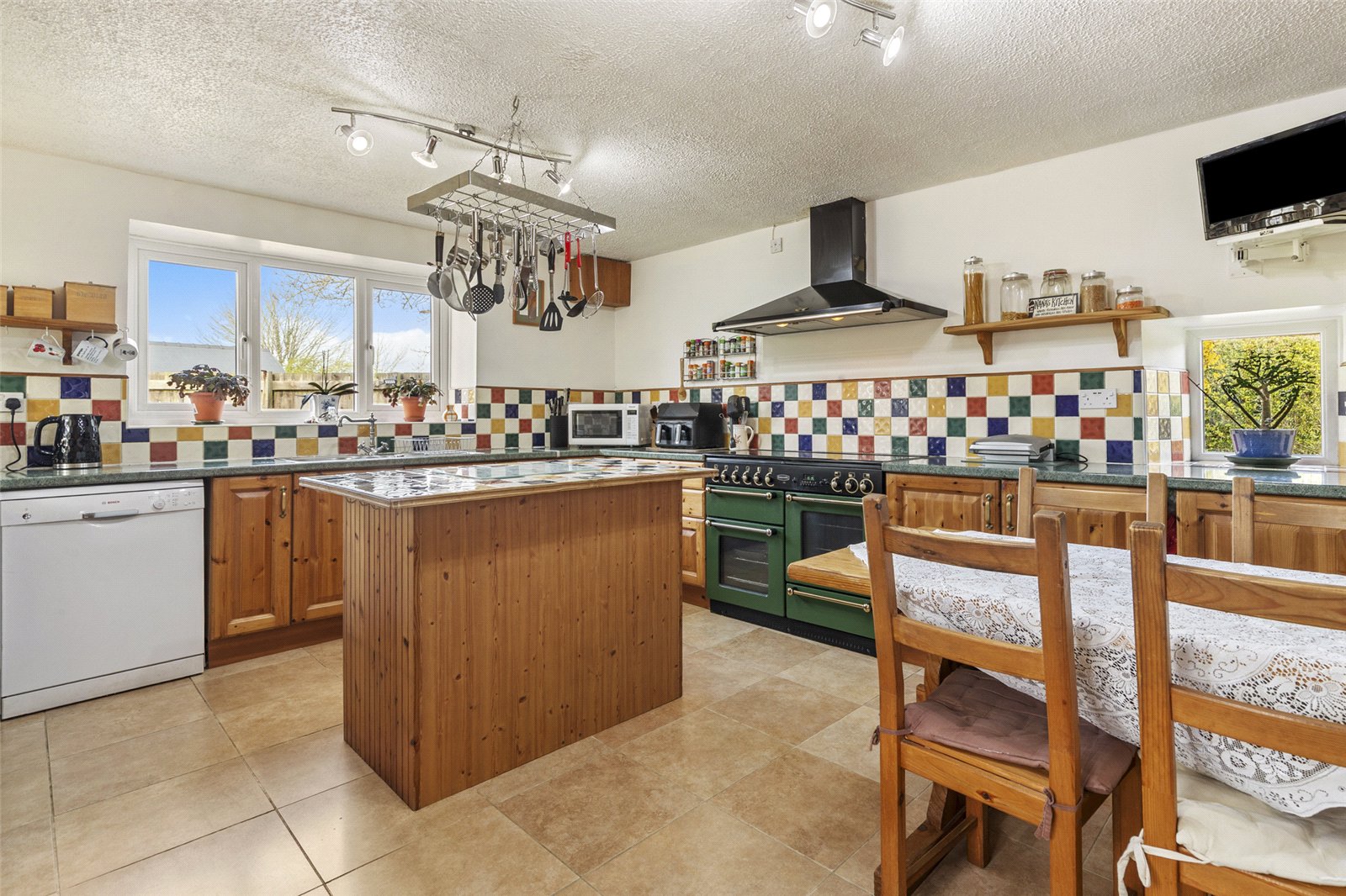 A charming, well equipped kitchen featuring wooden cabinetry, a colourful tiled splashback and a central island for extra workspace. With a range cooker, overhead utensil rack and a cosy dining area, it’s a warm and inviting hub of the home.