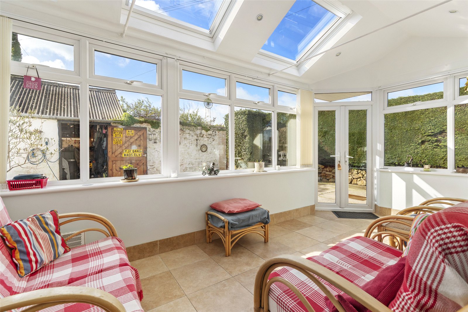 Bright and welcoming sunroom with large windows and skylights, offering a peaceful spot to relax while enjoying views of the courtyard garden. Finished with tiled flooring and plenty of space for seating, it’s a lovely year round retreat.