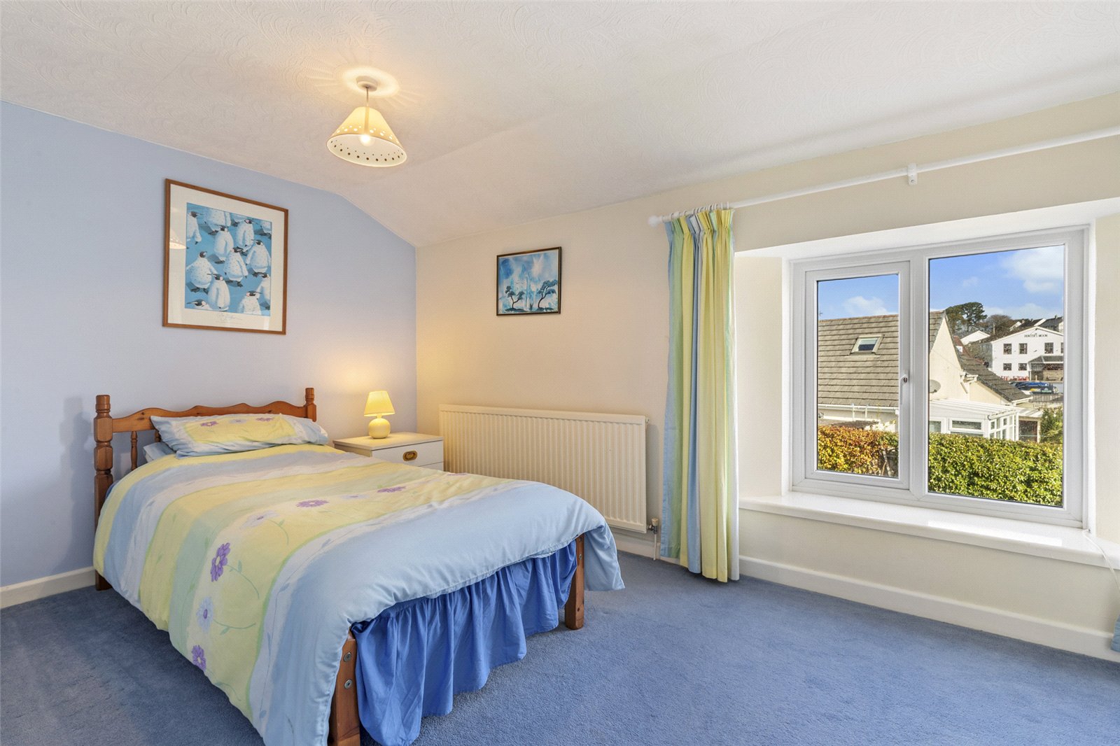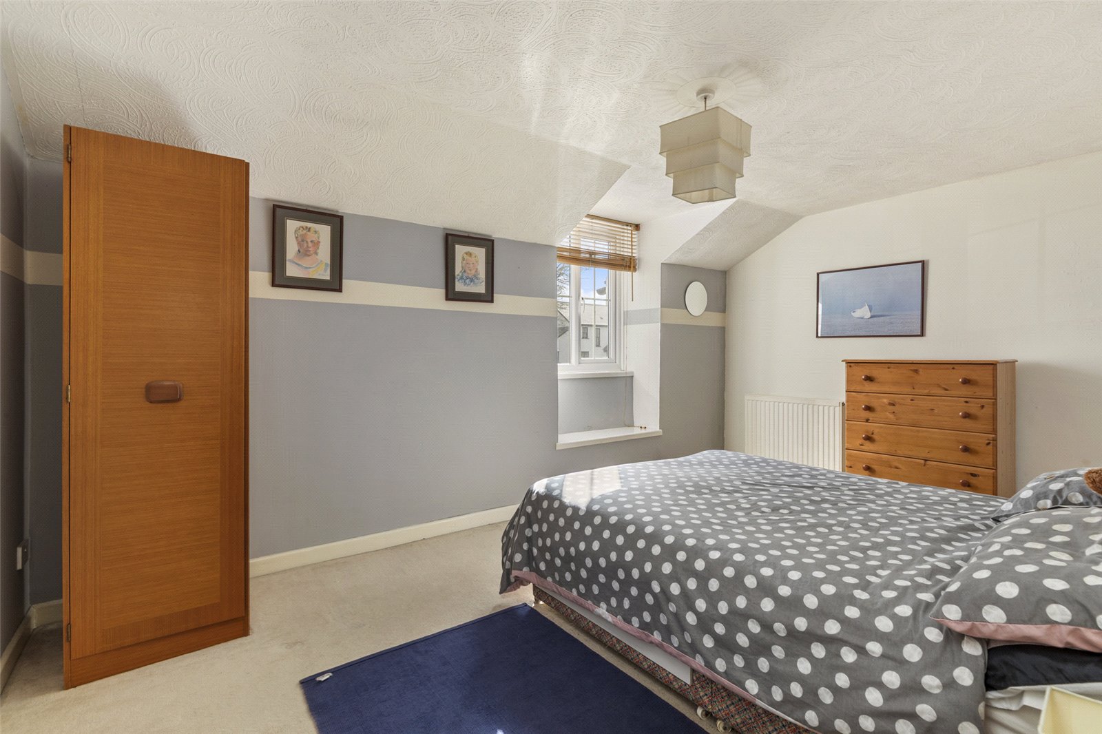 A bright and well proportioned bedroom featuring a sloped ceiling and a calm, neutral décor that creates a restful atmosphere. The room benefits from built in storage, helping to maximise floor space and keep the layout clean and practical. A window with fitted blinds brings in plenty of natural light, making this an inviting and comfortable space for everyday living.