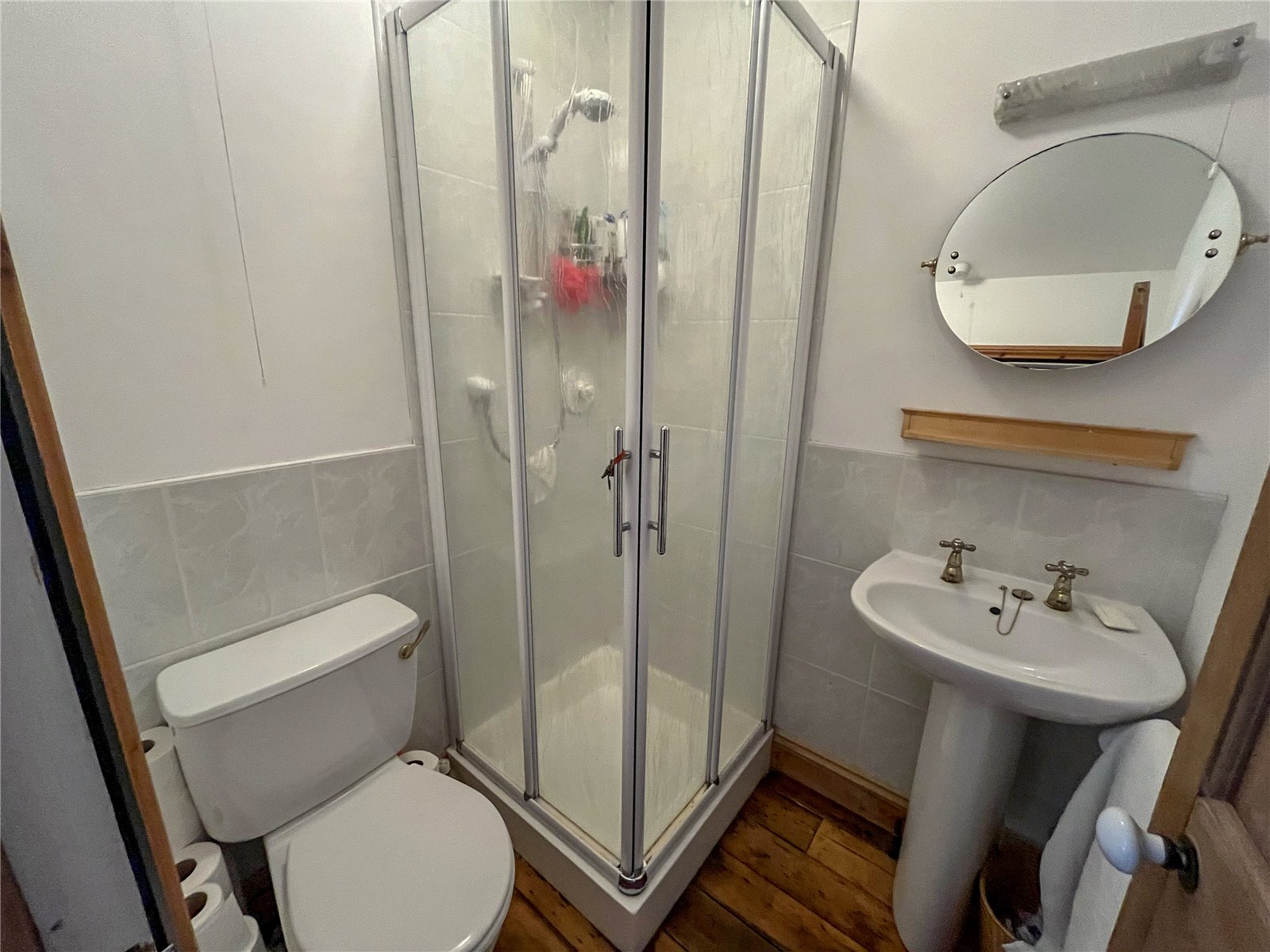 Ground floor shower room, with shower, wash bain, w/c, wood flooring, lighting, extractor and towel rail.