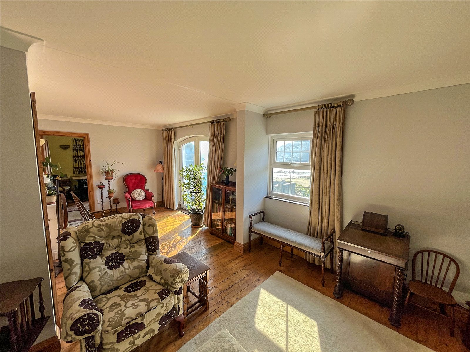 Sizeable L-shaped lounge affording exquisite views over Nolton Haven beach. Comprising of wooden flooring, fireplace with oak mantel and stone hearth, lighting, radiator, uPVC triple-glazed windows and French doors to terrace, as well as access to;