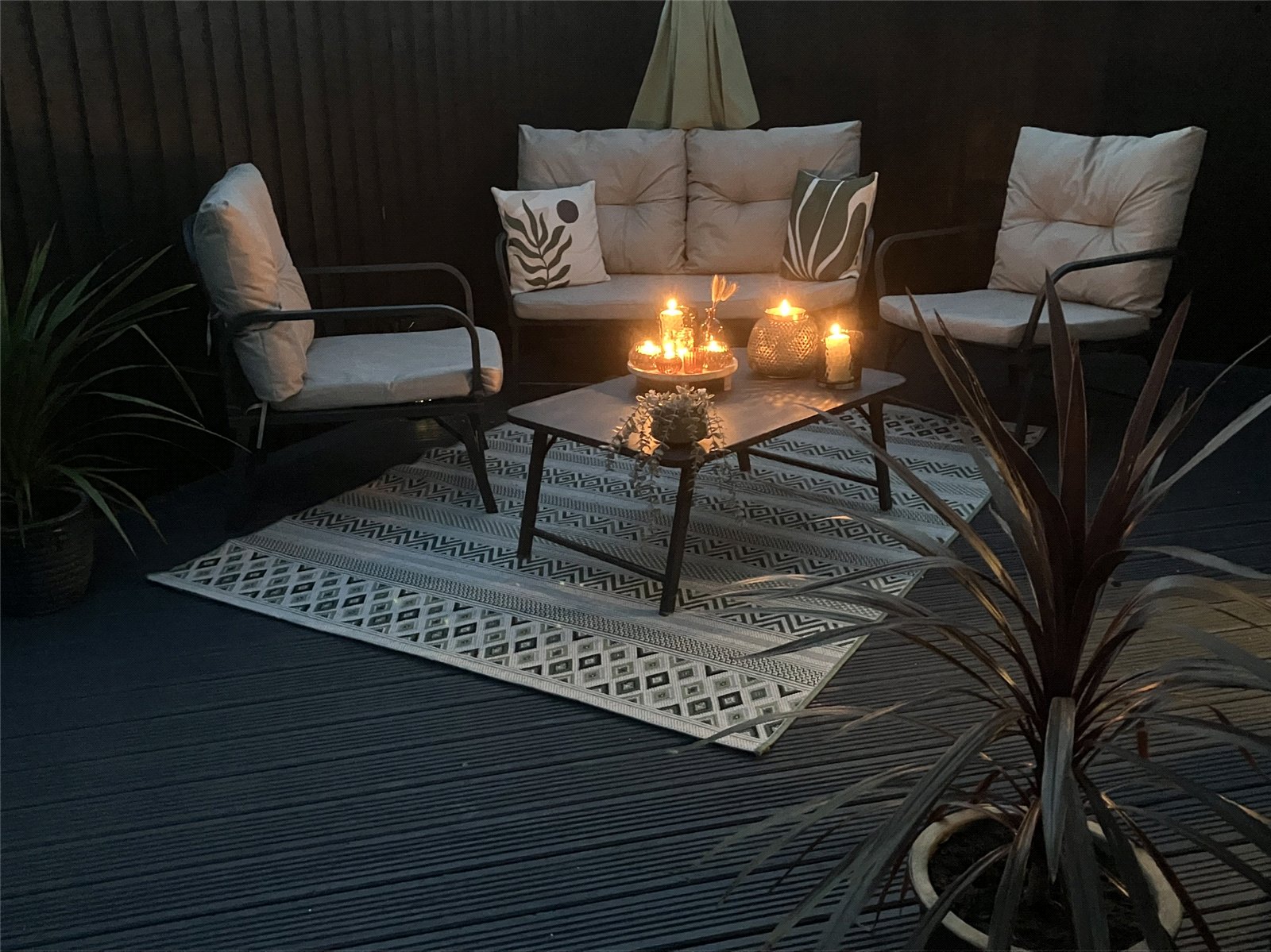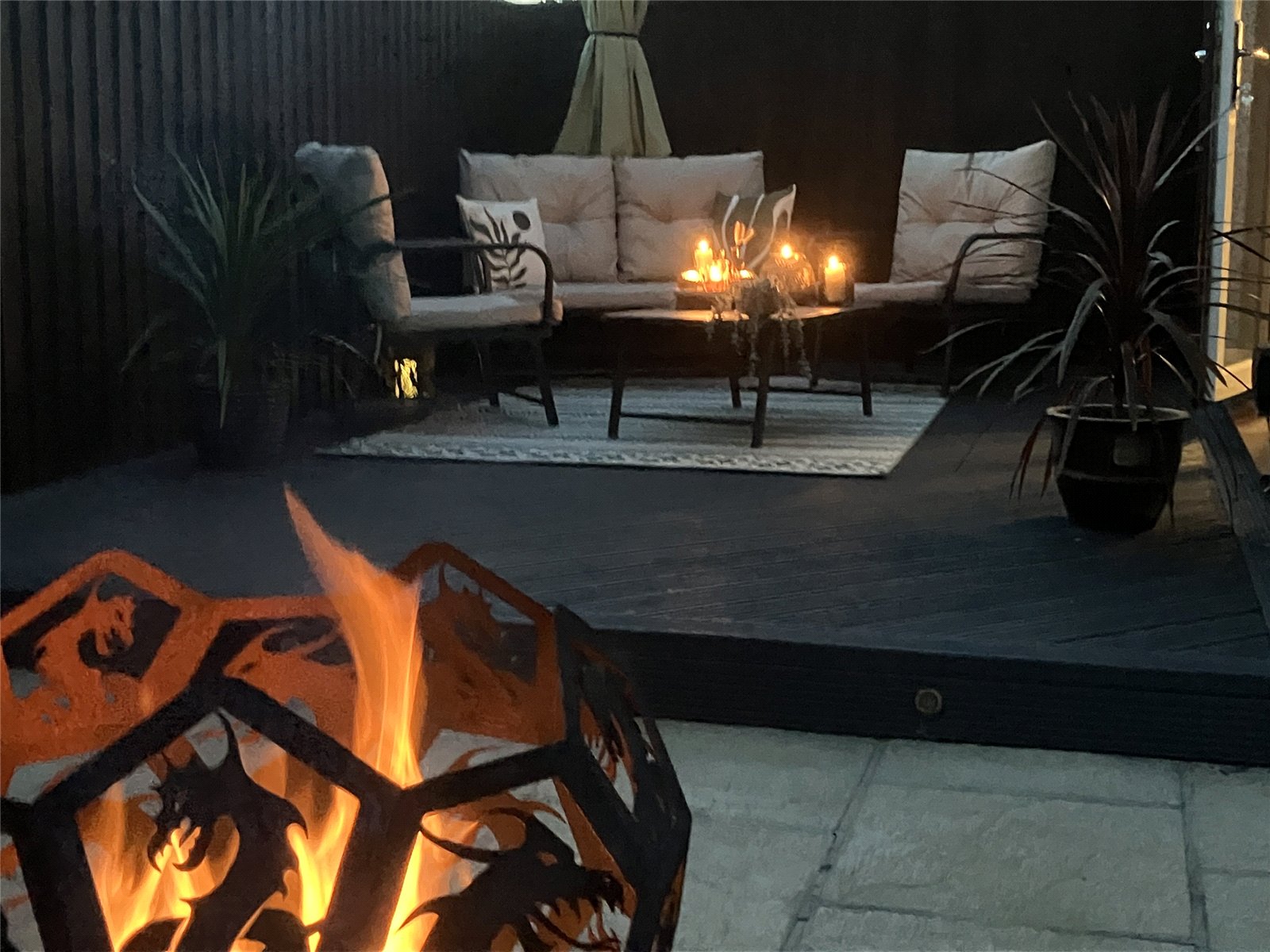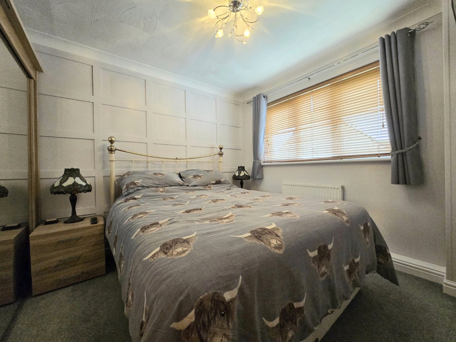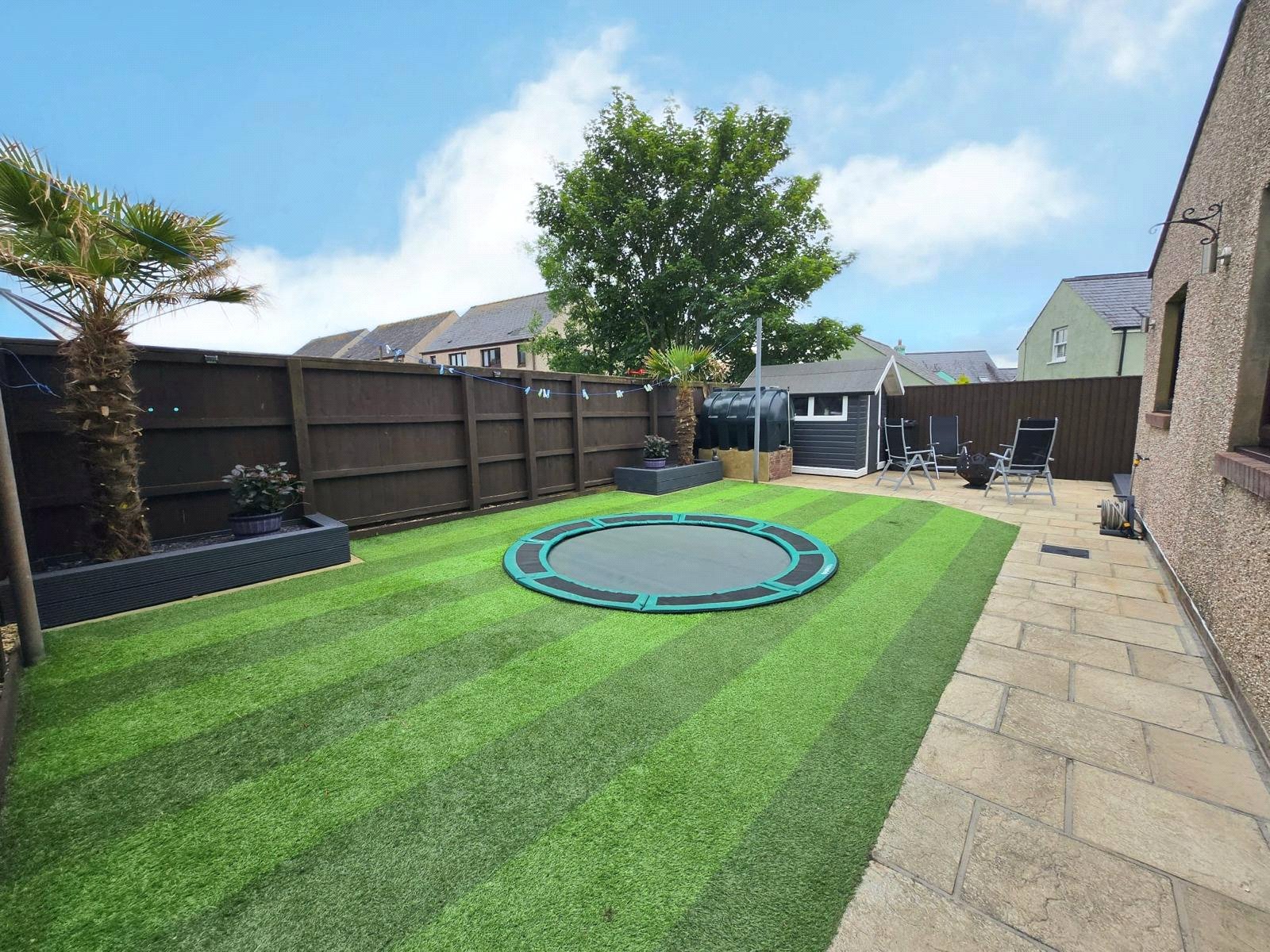 The rear of the property features a low-maintenance garden, complete with an oil tank and a garden shed for valuable extra storage. The outdoor space includes artificial grass, in ground trampoline, a decking area, and patio slabs, all enclosed by secure fencing with a side access gate, offering privacy and convenience. To the front, additional artificial grass complements a driveway with parking for two cars.