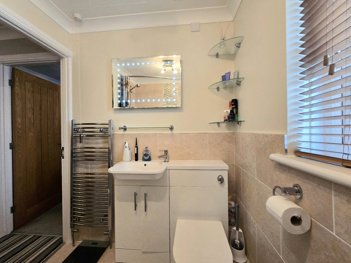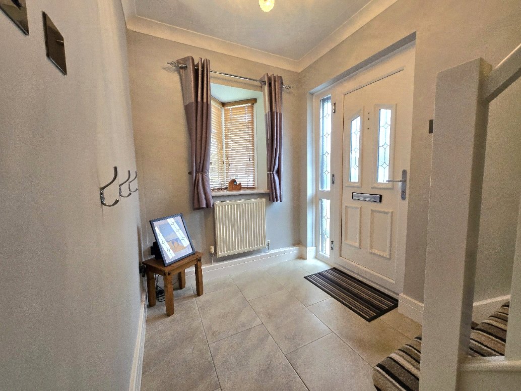 Side entrance door opens into a tiled hallway, featuring a front-facing double-glazed angled window that fills the space with natural light. The hallway includes a convenient understair storage area with built-in lighting, coat hooks, a light fitting, and a radiator, offering both functionality and warmth.