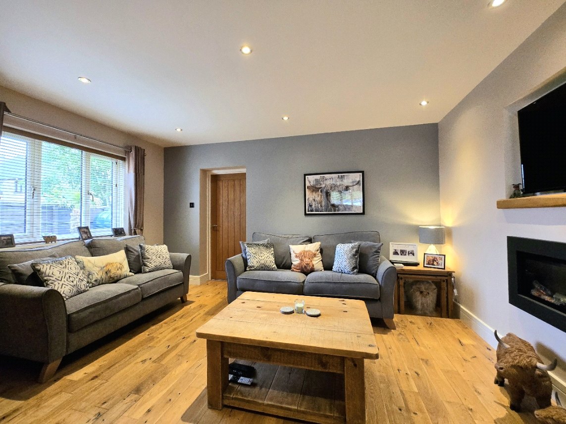 The room features elegant solid oak flooring and benefits from double-glazed windows to both the front and side, providing plenty of natural light. Additional features include a modern wall-mounted electric fire, a radiator for comfort, and contemporary spot lighting.