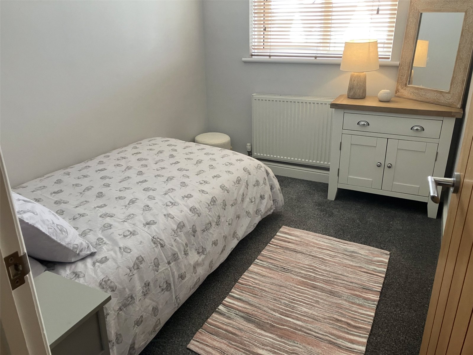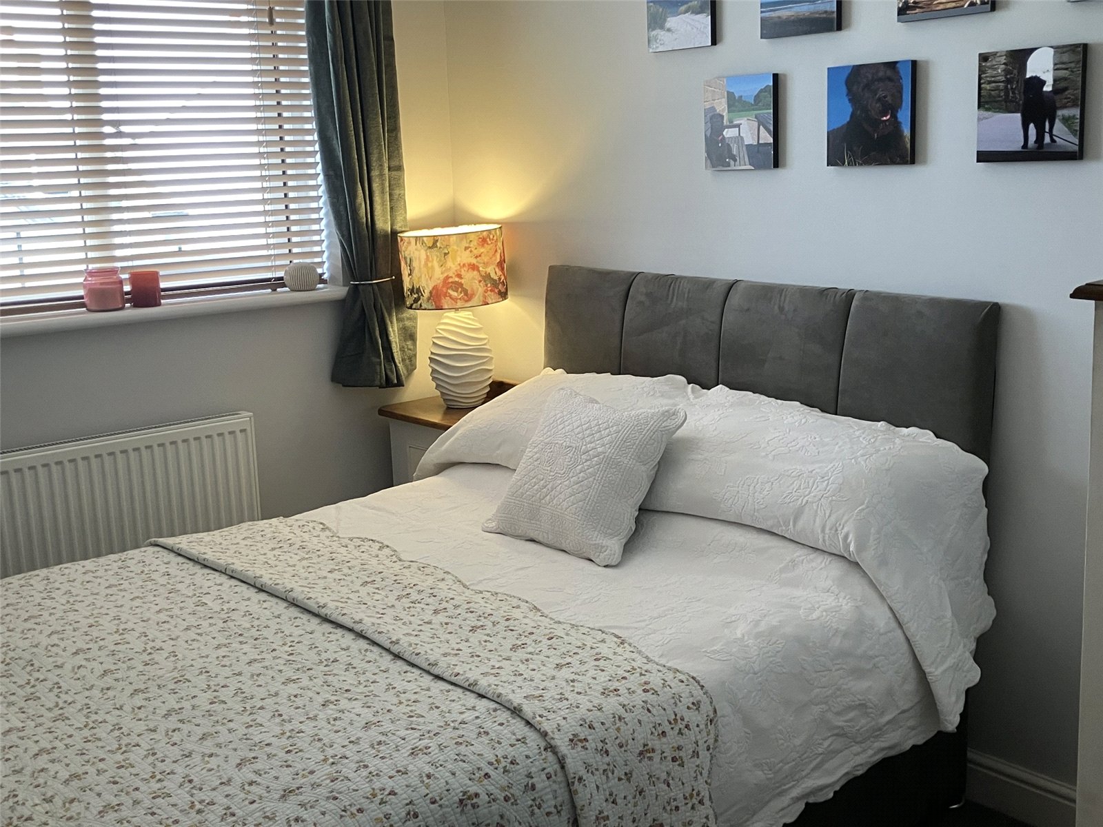 A stylish modern bedroom featuring fitted carpet, a radiator, and a contemporary ceiling light fitting. A double-glazed window to the rear provides natural light and a peaceful outlook.