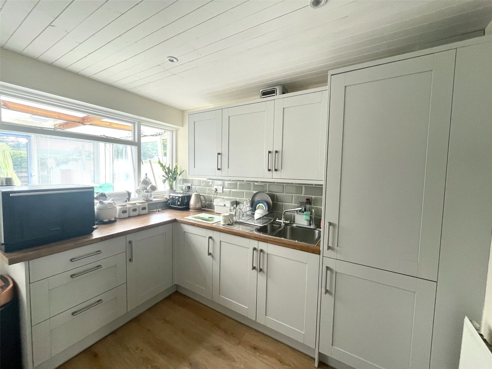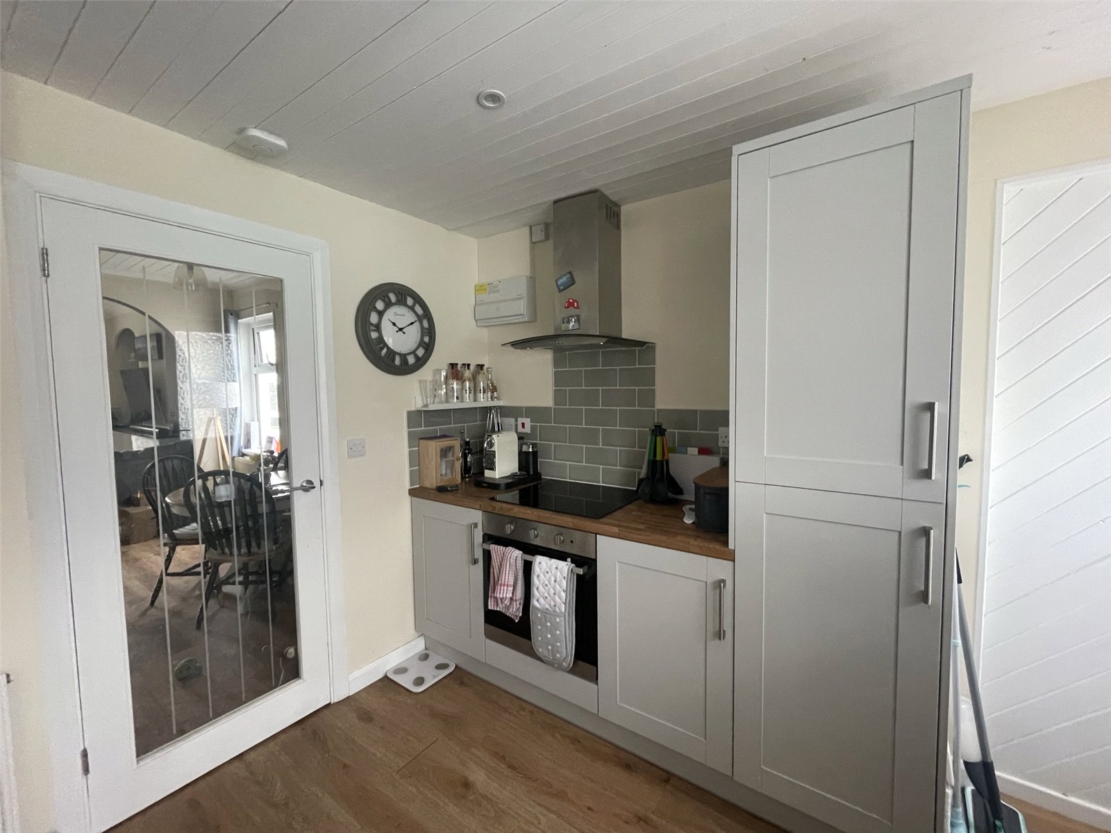 Laminate floor continues, a range of base and wall units with tiles surround, integrated fridge, freezer, electric oven, electric hob with overhead extractor fan and light, 1.5 sink and drainer with taps, access to new boiler, radiator, spot lights, door to: