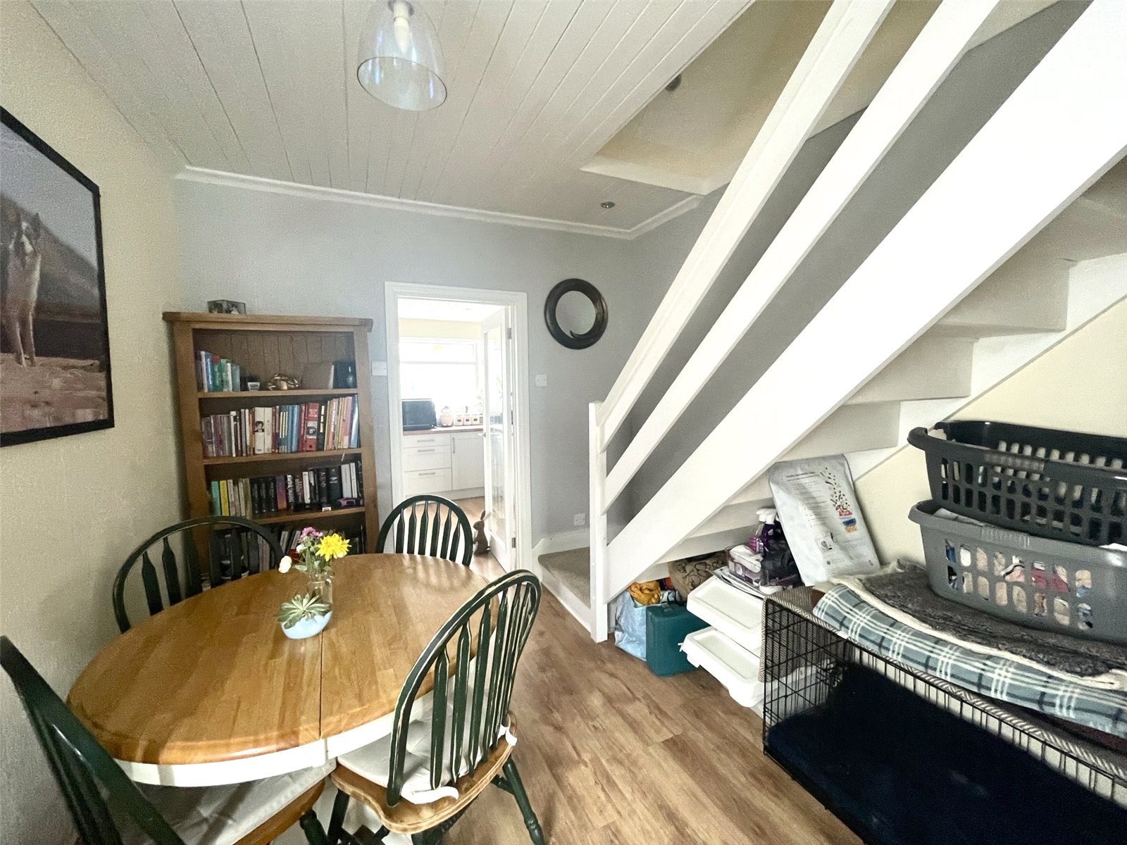 Laminate flooring, radiator, ceiling light, stairs to first floor, storage cupboard with plumbing for washing machine, uPVC double glazed window, door leading to: