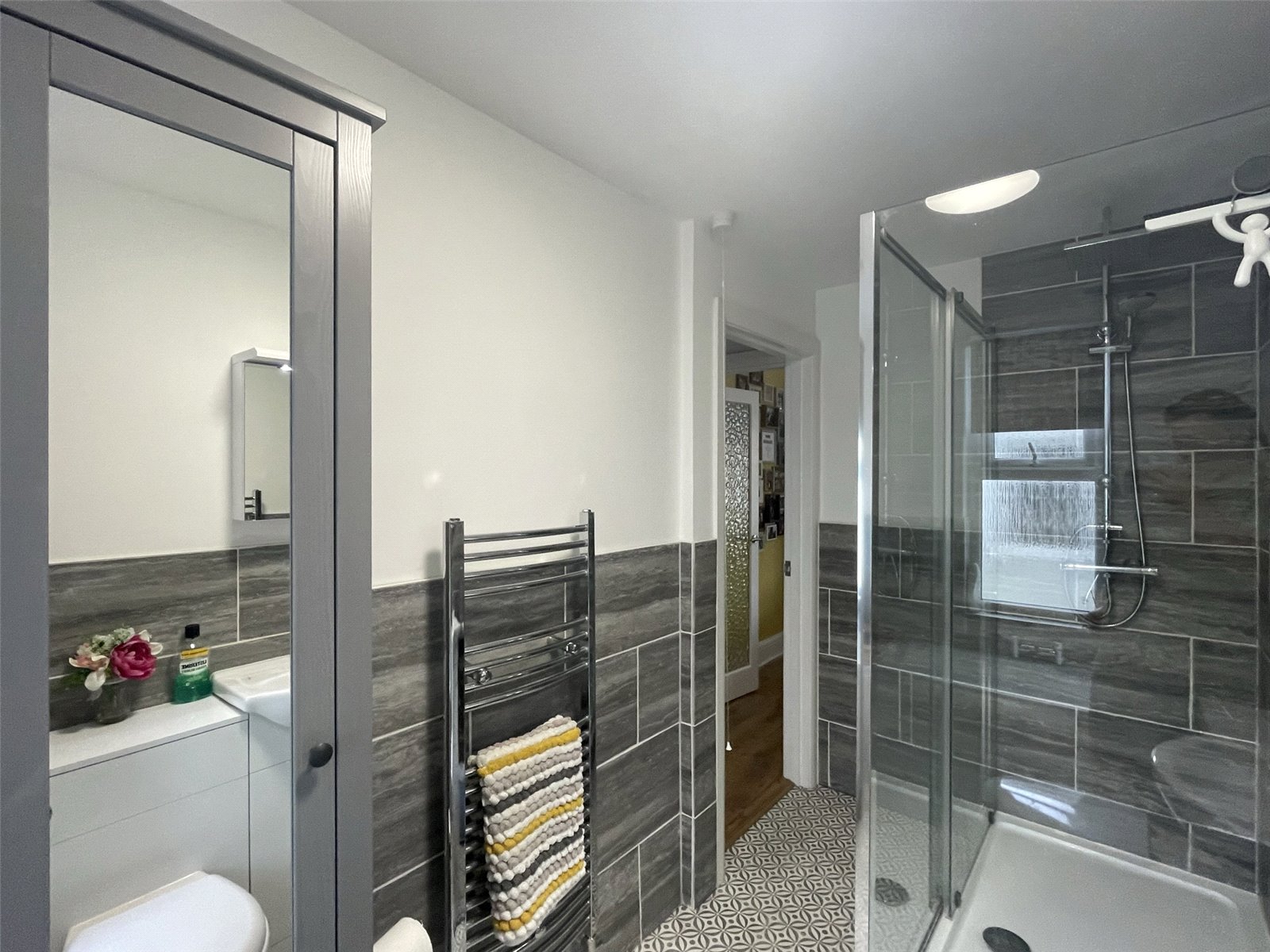 Vinyl floor, partially tiled walls, walk in shower, WC and wash hand basin vanity unit, heated towel rail, ceiling light, uPVC double glazed window with obscure glass.