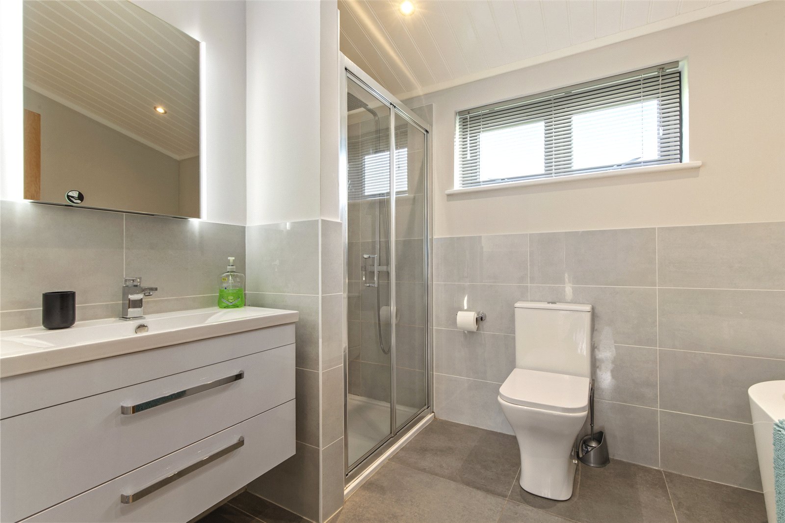 Includes a heated towel rail, WC, white sink with vanity unit and storage beneath, obscured glass window, tiled floor, and partially tiled walls. Features a waterfall shower with glass screen.
